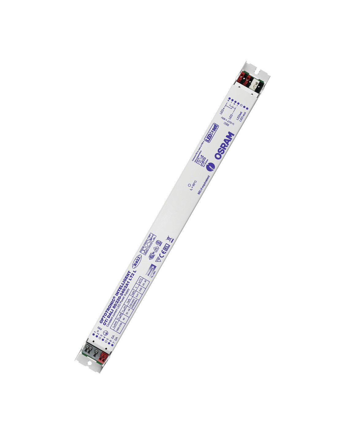 Cechy produktu: Napięcie zasilania: 220…240 V. Częstotliwość linii: 0 Hz | 50 Hz | 60 Hz. Napięcie sieciowe: 198…264 V. Bezpieczeństwo zgodnie z normami PN-EN 61347-1, 61347-2-3, 61347-2-13, 62384. Tłumienie IR zgodnie z PN-EN 55015:2007+A1:2007/CDN. Harmoniczne prąd:u zgodnie z PN-EN 61000-3-2. Odporność zgodna z normą EN 61547. Trwałość: aż do 100 000 godzin (temperatura w punkcie Tc = 65 °C, maks. 10 % współczynnik uszkodzeń). Dostępna wersja SELV i nieizolowana. Zalety produktu: Wszechstronny sterownik okien DALI o mocy aż do 90 W ze względu na elastyczną charakterystykę wyjściową. Bardzo wysoka skuteczność i niezawodność. Ochrona systemu dzięki odprowadzeniu ciepła i Smart Control. Obszary zastosowań: Instalacja w systemach oświetlenia awaryjnego zgodnie z IEC 61347-2-13, załącznik J. Nadaje się do użytku w oprawach z elastycznym ustawieniem wartości prądu (DALI, CLO, LEDset). Przeznaczony do opraw o klasie ochronności I.