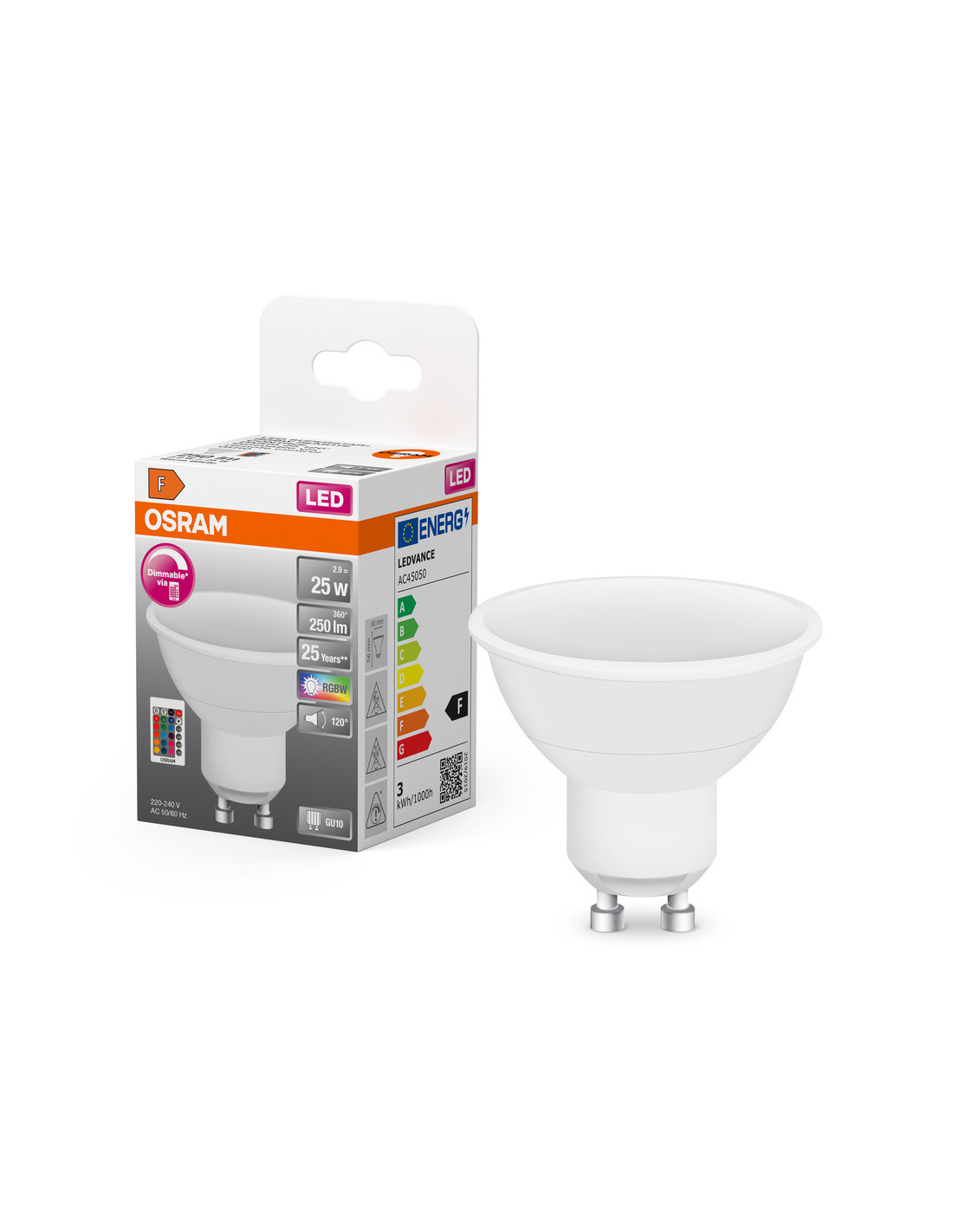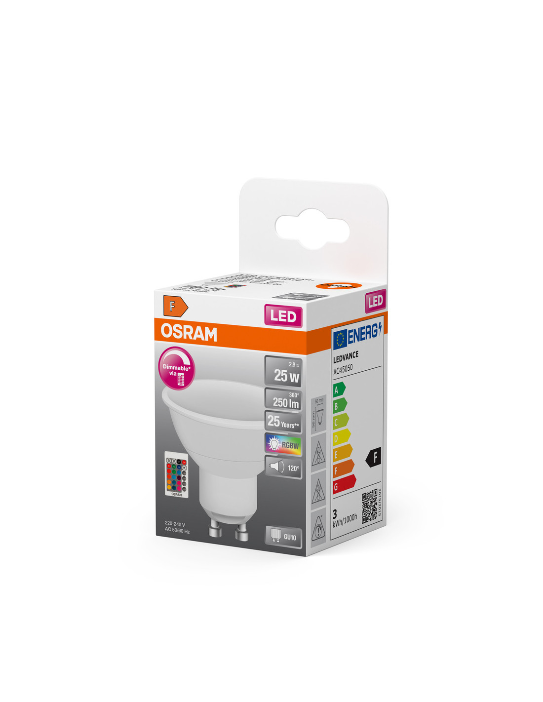 Cechy produktu: Trwałość: do 25 000 h. Umożliwia sterowanie barwą, nasyceniem i poziomami przyciemnienia światła. Szeroka gama barw światła, w tym barwa biała. Cztery efekty dynamiczne: błyski, stroboskop, płynne przejścia i nastrój. Ściemnianie za pomocą pilota. Zalety produktu: Łatwa instalacja. Niższe zużycie energii w porównaniu do lamp żarowych lub halogenowych. Indywidualne sterowanie. Do sterowania lampą nie jest potrzebna żądna aplikacja ani smartfon. Komfortowy w obsłudze i intuicyjny pilot zdalnego sterowania na podczerwień. Przełączanie, 4 poziomów ściemniania i sterowanie barwą światła przy pomocy przycisku. Barwne pętle umożliwiające dynamiczne zmiany barw. Obszary zastosowań: Zastosowania domowe. Do użytku na zewnątrz tylko w odpowiednich oprawach zewnętrznych. Porady dotyczące bezpieczeństwa: Nie dotykaj lampy, jeśli jest stłuczona.. Nie wolno używać, jeśli zewnętrzne źródło światła jest uszkodzone..