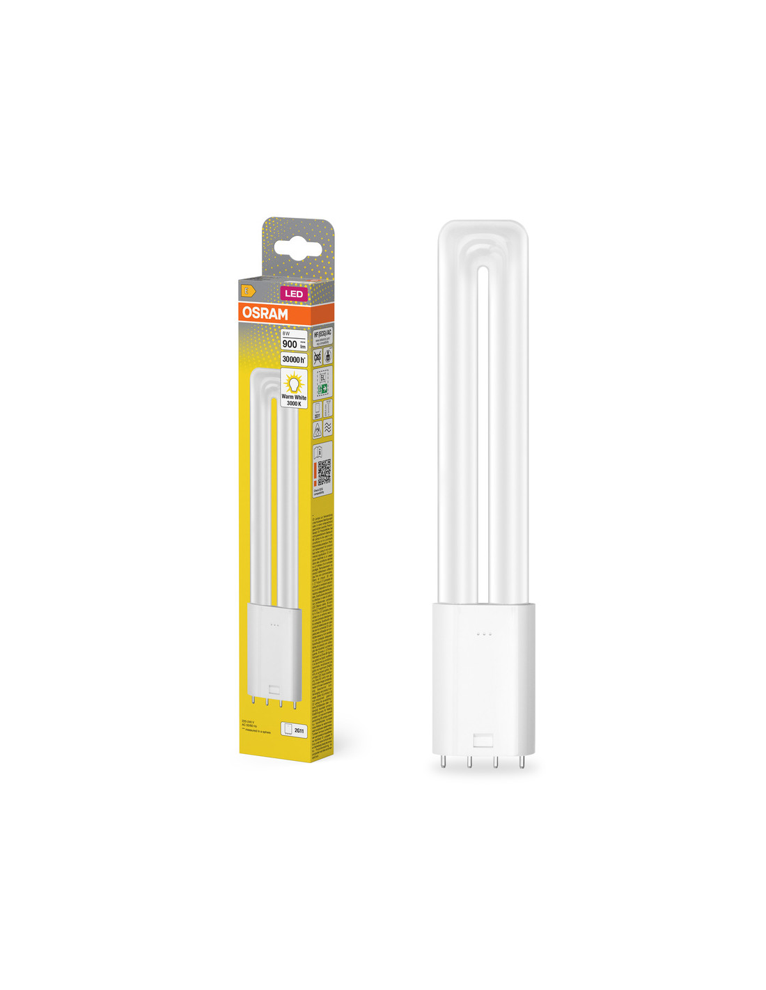 Cechy produktu: Trwałość: do 30 000 h. Jednotrzonkowa, trzonek 4-kołkowy wtykowy 2G11. Stopień ochrony: IP20. Lampy niezawierające rtęci. Zalety produktu: Łatwa instalacja. Niskie zużycie energii. Nieodpowiednie do pracy z konwencjonalnymi statecznikami. Łatwa wymiana lamp dzięki kompaktowej konstrukcji. Możliwe bezpośrednie zasilanie z sieci 230 V AC. Obszary zastosowań: Oświetlenie ogólne – dla temperatur otoczenia w zakresie -20…+45 °C. Biura, budynki publiczne. Sklepy. Hotele, restauracje. Przemysł. Porady dotyczące bezpieczeństwa: Nieodpowiednie do pracy z konwencjonalnymi statecznikami.. Zakres temperatury roboczej DULUX LED jest ograniczony. W przypadku wątpliwości co do przydatności aplikacji, przed instalacją należy zmierzyć temperaturę Tc na produkcie.. Wszystkie podłączenia elektryczne muszą być wykonane przez osobę wykwalifikowaną.. Nie nadaje się do oświetlenia awaryjnego.. Nie dotykaj lampy, jeśli jest stłuczona.. Nie wolno używać, jeśli zewnętrzne źródło światła jest uszkodzone..