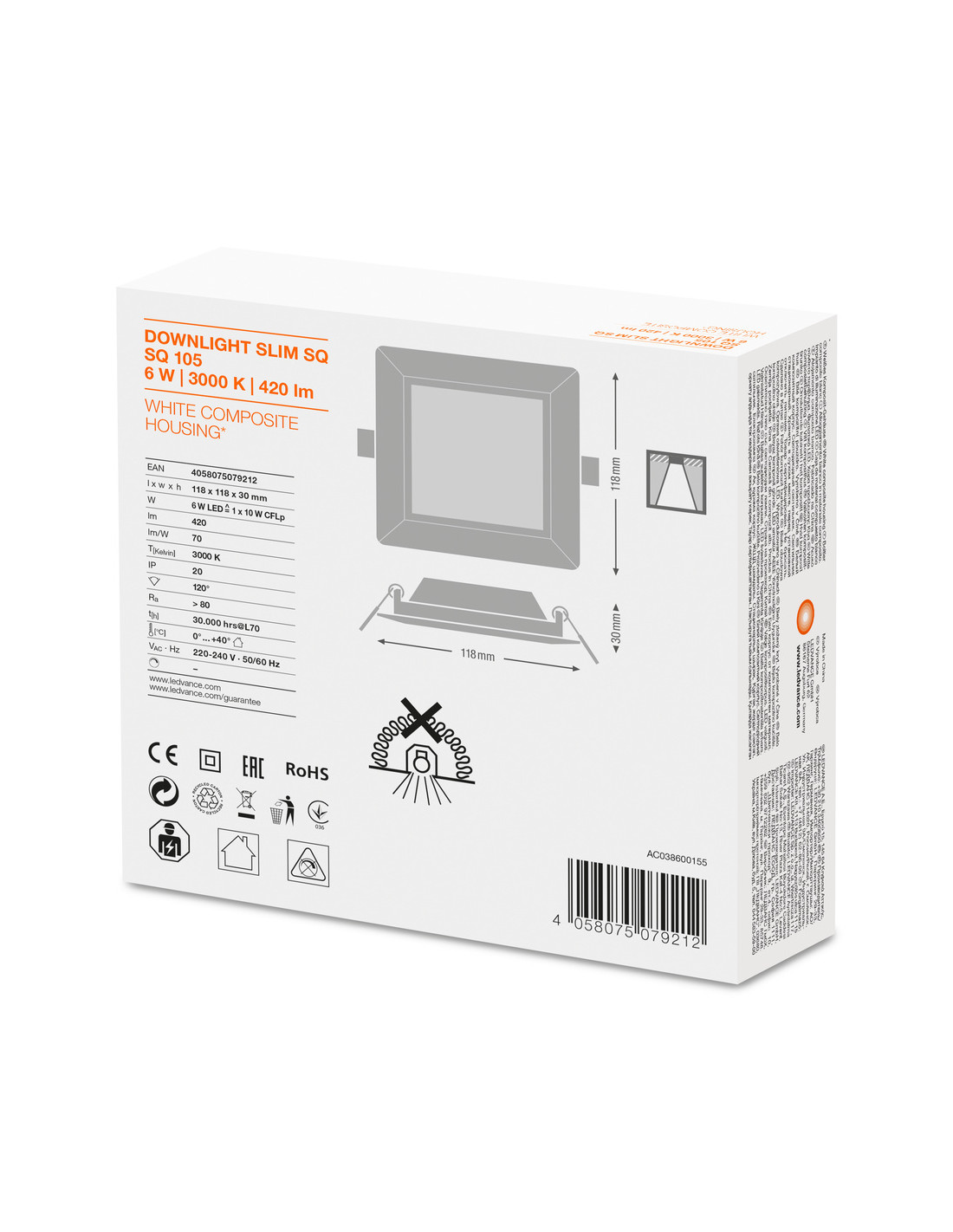 DOWNLIGHT DL SLIM SQ105 6W/3000K WT IP20