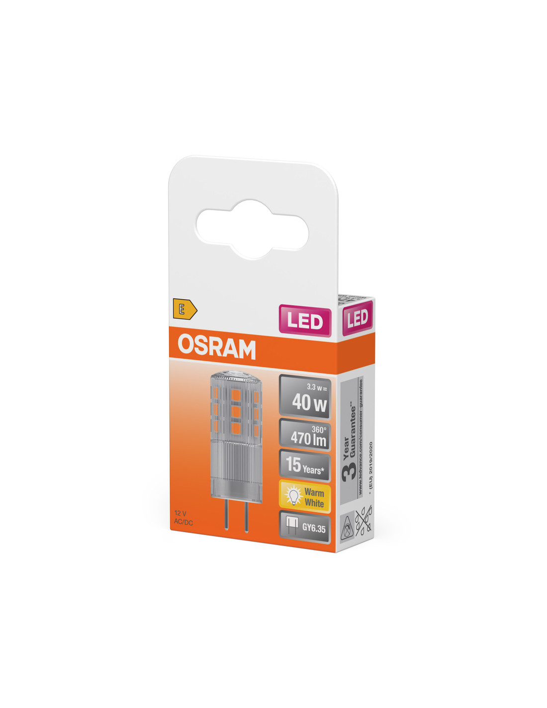 Cechy produktu: Zgodność z wieloma konwencjonalnymi i elektronicznymi zasilaczami (patrz również compatibility list). Zamiennik LED dla niskonapięciowych żarówek halogenowych. Trzonek: G4, GY6.35. Zalety produktu: Praca alternatywnie z zasilaniem prądem stałym lub przemiennym. Równomierny rozsył światła we wszystkich kierunkach. Idealne do zastosowania dekoracyjnego oraz do eksploatacji bez oprawy. Długa trwałość do 15 000 godzin. 3-letnia gwarancja. Niższe zużycie energii w porównaniu do lamp żarowych lub halogenowych. Obszary zastosowań: Zastosowania dekoracyjne. Nastrojowe oświetlenie akcentujące w całym domu. Do użytku na zewnątrz tylko w odpowiednich oprawach zewnętrznych. Porady dotyczące bezpieczeństwa: Nie dotykaj lampy, jeśli jest stłuczona.. Nie wolno używać, jeśli zewnętrzne źródło światła jest uszkodzone.. Aby zapewnić pełną wydajność oświetlenia i trwałość produktu, zalecane jest demontaż szyby lub osłony oprawy oświetleniowej..