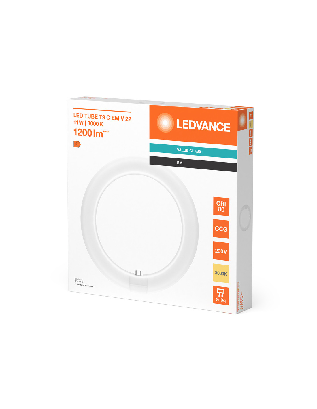 Cechy produktu: Zamiennik LED dla klasycznych świetlówek T9 w oprawach oświetleniowych ze statecznikami elektronicznymi. Równomierne oświetlenie. Trwałość: do 30 000 h. Bez rtęci, zgodne z RoHS. Zalety produktu: Szybka, prosta i bezpieczna wymiana bez zmiany okablowania. Oszczędność energii do 50 % (w porównaniu do świetlówki T9). Nadaje się również do pracy w niskich temperaturach. Możliwe bezpośrednie zasilanie z sieci 230 V AC. Obszary zastosowań: Oświetlenie ogólne – dla temperatur otoczenia w zakresie -20…+45 °C. Korytarze, klatki schodowe, garaże. Zastosowania domowe. Zastosowania dekoracyjne. Porady prawne: Przy użytkowaniu zamiennika świetlówki T9 całkowita sprawność energetyczna i rozsył strumienia świetlnego zależą od rodzaju systemu oświetlenia.. Porady dotyczące bezpieczeństwa: Nieprzystosowane do pracy z elektronicznymi układami zasilającymi.. Możliwa praca w zastosowaniach zewnętrznych w odpowiednich oprawach odpornych na wilgoć zgodnie z kartą katalogową i instrukcją instalacji.. Wszystkie podłączenia elektryczne muszą być wykonane przez osobę wykwalifikowaną.. Przed instalacją należy odłączyć zasilanie.. Oprawa nie nadaje się do użytku awaryjnego..