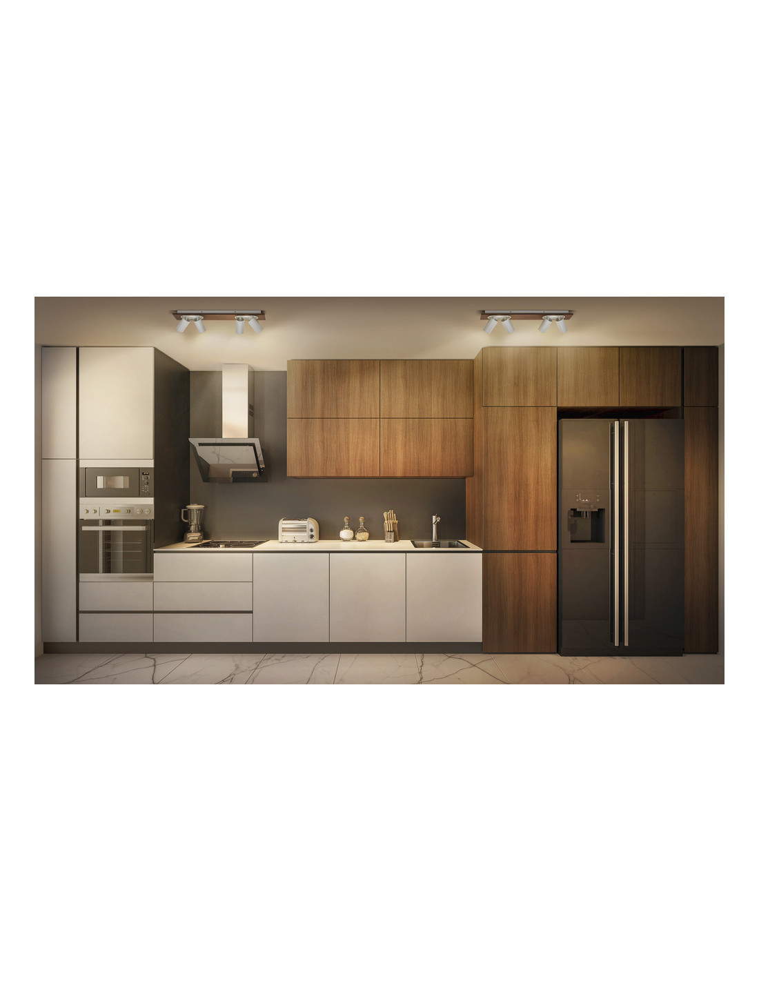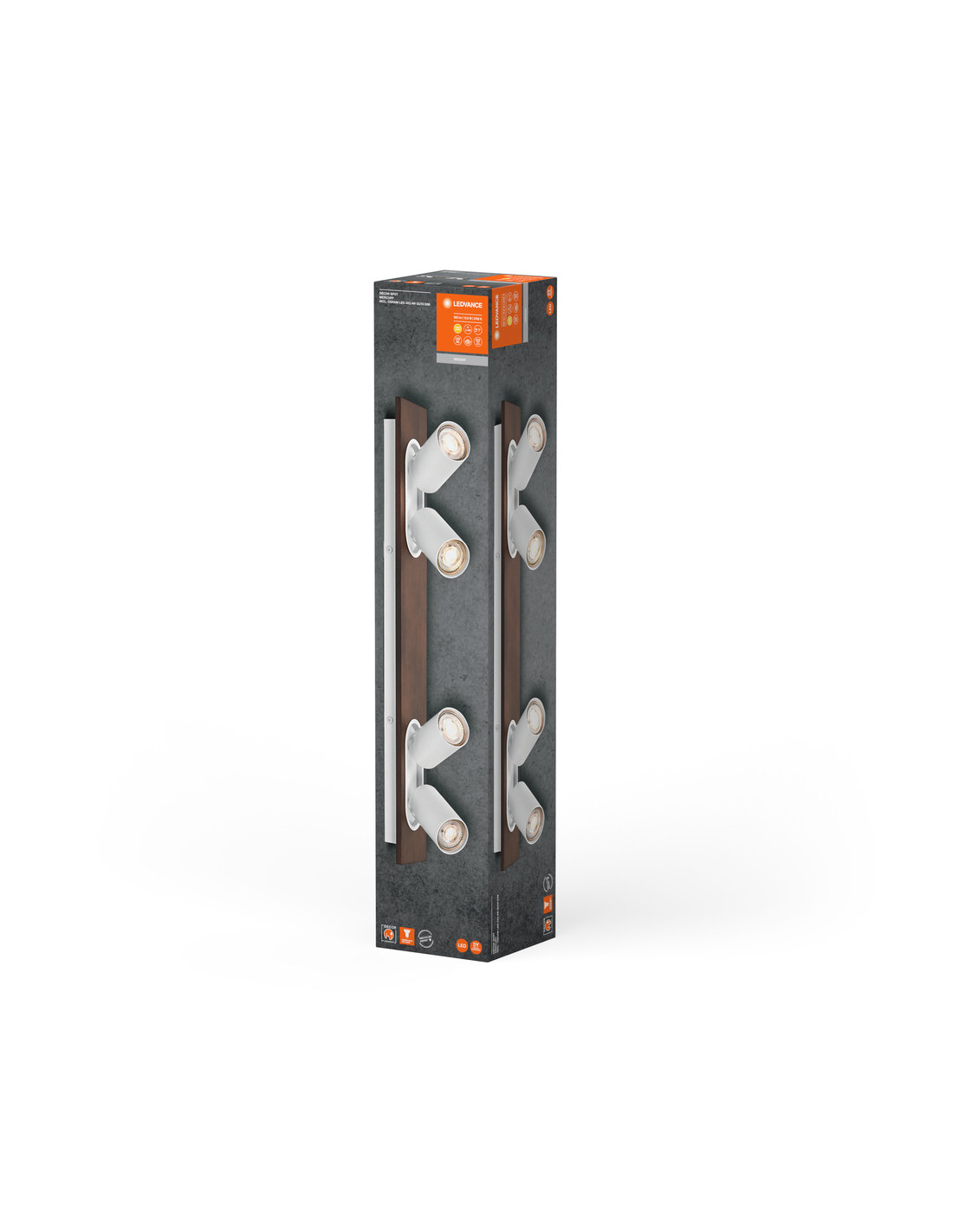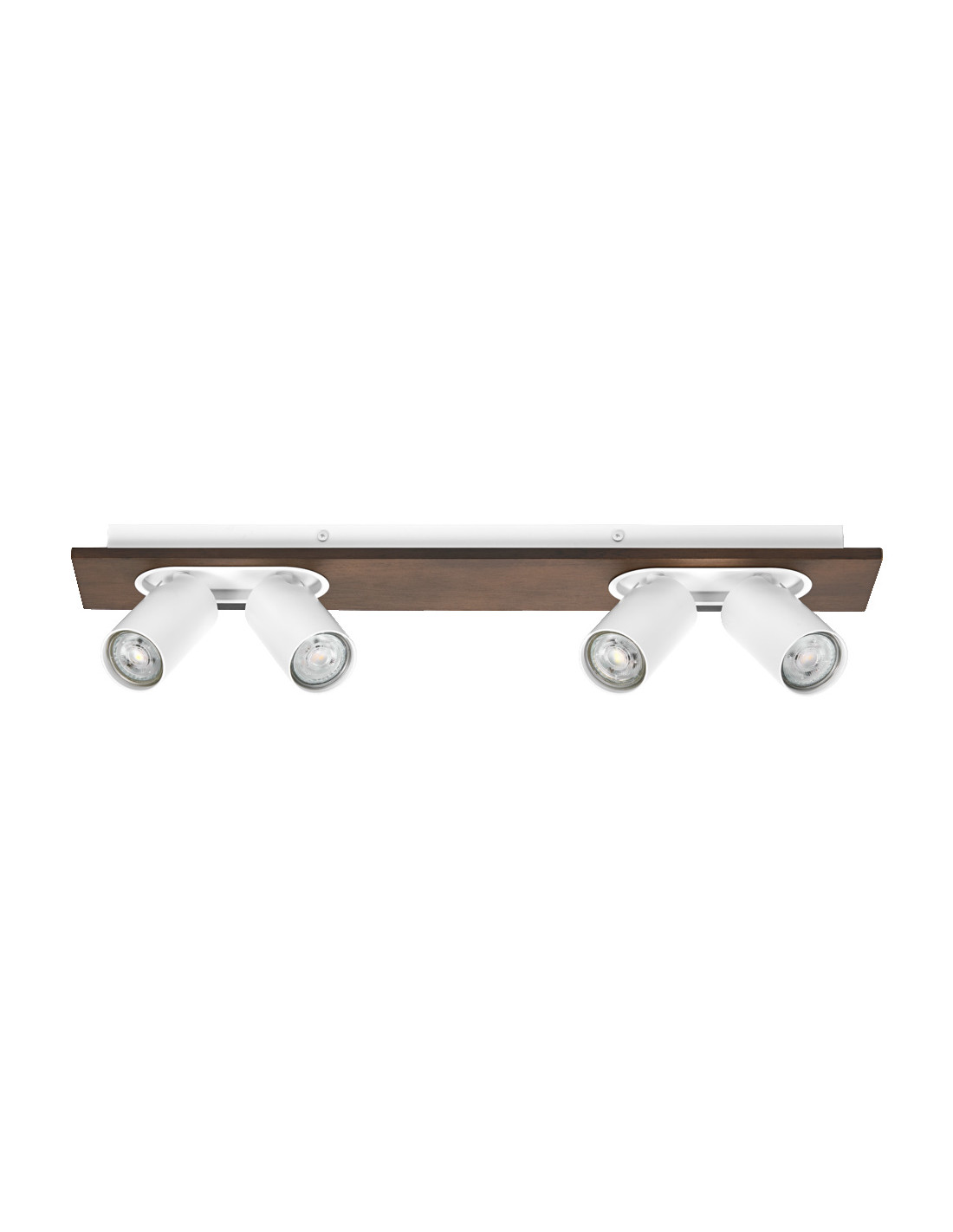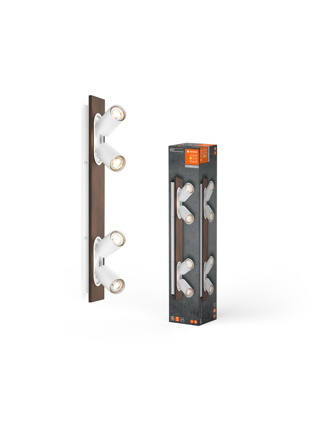 Cechy produktu: Rodzina opraw obejmuje cztery wersje z maksymalnie 4 głowicami punktowymi. Materiał obudowy: metal i drewno. Włącznik/wyłącznik w wersji 1-głowicowej dla łatwej obsługi. Regulowane oprawy. Zalety produktu: Wysoka jakość . Wysokiej jakości obudowa o białej lub czarnej matowej powierzchni. Uniwersalne rozwiązanie dzięki wymiennym lampom LED. W zestawie ściemniana lampa OSRAM. Łatwy montaż. Obszary zastosowań: Zastosowania wewnętrzne. Korytarze, wejścia, klatki schodowe, pokoje dzienne, sutereny. Kuchnie, przestrzenie robocze. Montaż powierzchniowy na suficie i ścianach. Wyposażenie / Akcesoria: Kompletne akcesoria do montażu i podłączenia w zestawie. Porady dotyczące bezpieczeństwa: Wszystkie podłączenia elektryczne muszą być wykonane przez osobę wykwalifikowaną.. Uwaga, ryzyko porażenia prądem.. Produkt w klasie ochrony I. Wszystkie przewodzące prąd, metalowe części obudowy, które mogą absorbować napięcie podczas pracy lub podczas konserwacji w przypadku awarii, muszą być stale PODŁĄCZONE do przewodu uziemiającego..
