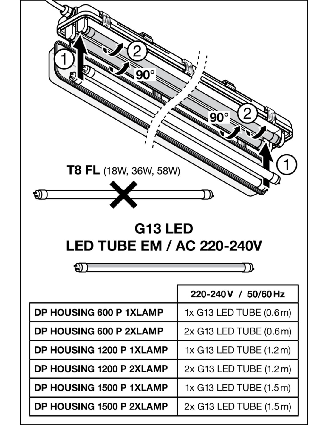 Cechy produktu: Obudowa oprawy, dostępna na 1 lub 2 tuby LED T8. Nadaje się do LED TUBE T8 EM i LED TUBE T8 CONNECTED. Stopień ochrony: IP65. Zintegrowany bezpiecznik elektryczny. Zalety produktu: Łatwa i szybka instalacja. Wcześniej przygotowane oprzewodowanie ułatwia instalację tub LED. Instalacja bez użycia narzędzi. Trwała obudowa. Zrównoważone rozwiązanie dzięki wymiennym źródłom światła. 5-letnia gwarancja. Obszary zastosowań: Parkingi, magazyny, obszary produkcyjne. Parkingi i przejścia podziemne. Garaże. Wyposażenie / Akcesoria: Wszystkie wymagane akcesoria w zestawie. Dostępny zestaw oprzewodowania przelotowego.