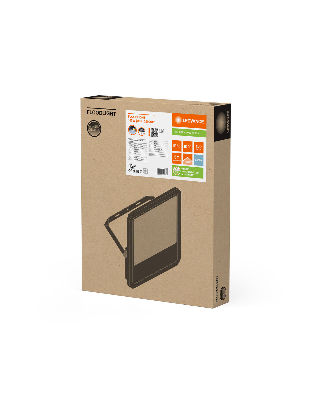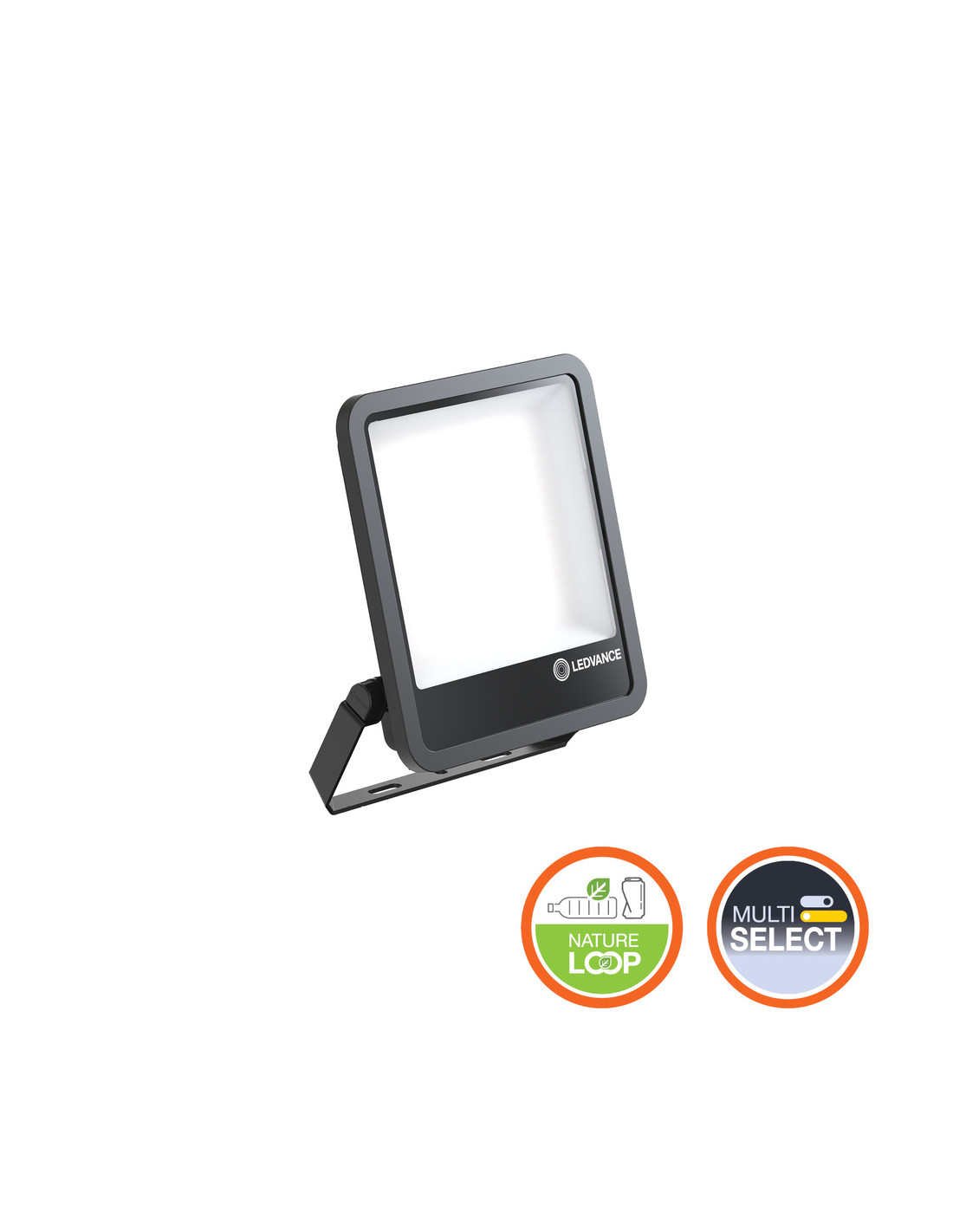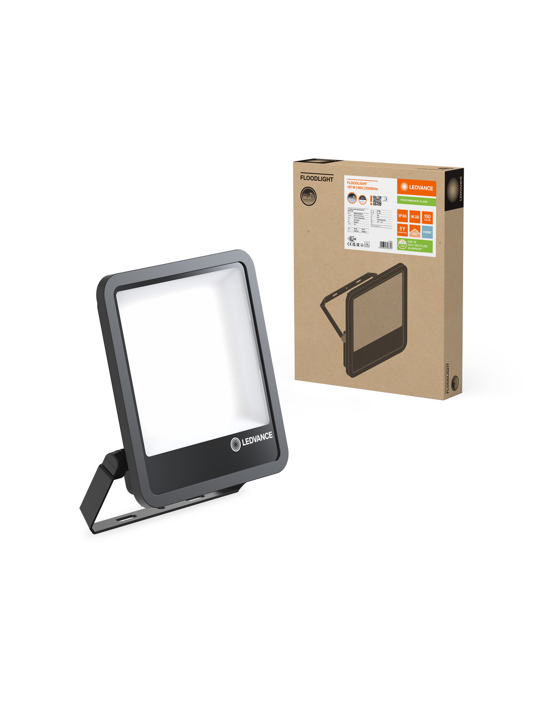 Cechy produktu: Wysoka skuteczność świetlna: do 150 lm/W. Stopień ochrony: IP66. Fabrycznie zainstalowany, elastyczny przewód o długości 1 m (H05RN-F), 3 x 1,0 mm. Odbłyśnik, symetryczny rozsył światła z kątem rozsyłu 100° x 100°. Zaciski montażowe z kątem 30° i szerokim obszarem obrotu. Zalety produktu: Zawór odpowietrzający optymalizujący wymianę powietrza, bez uszczerbku dla stopnia ochrony IP. Wysoka wszechstronność dzięki wybieranym stopniom mocy (Multi Lumen) na obudowie. Solidna dławnica kablowa ze zintegrowaną funkcją bariery wodnej. Bezpieczne i bardzo równomierne oświetlenie dzięki wykonanemu ze szkła hartowanego matowemu kloszowi. Jasna, odporna i trwała. Oszczędność energii aż do 90% (w porównaniu z naświetlaczami z lampami halogenowymi). Brak górnego współczynnika rozsyłu światła (ULOR 0%) w przypadku zamontowania pod kątem 0°. Obszary zastosowań: Zamiennik naświetlaczy do żarówek halogenowych. Zastosowania zewnętrzne (IP66). Konstrukcja zgodna z normą EN 60598-2-24 dotyczącą zagrożenia pożarowego, np. poprzez nagromadzenie pyłów. Strefy publiczne. Elewacje budynków. Tereny budowy. Parking. Porady dotyczące bezpieczeństwa: Maks. powierzchnia obciążenia wiatrem 0,105 m.