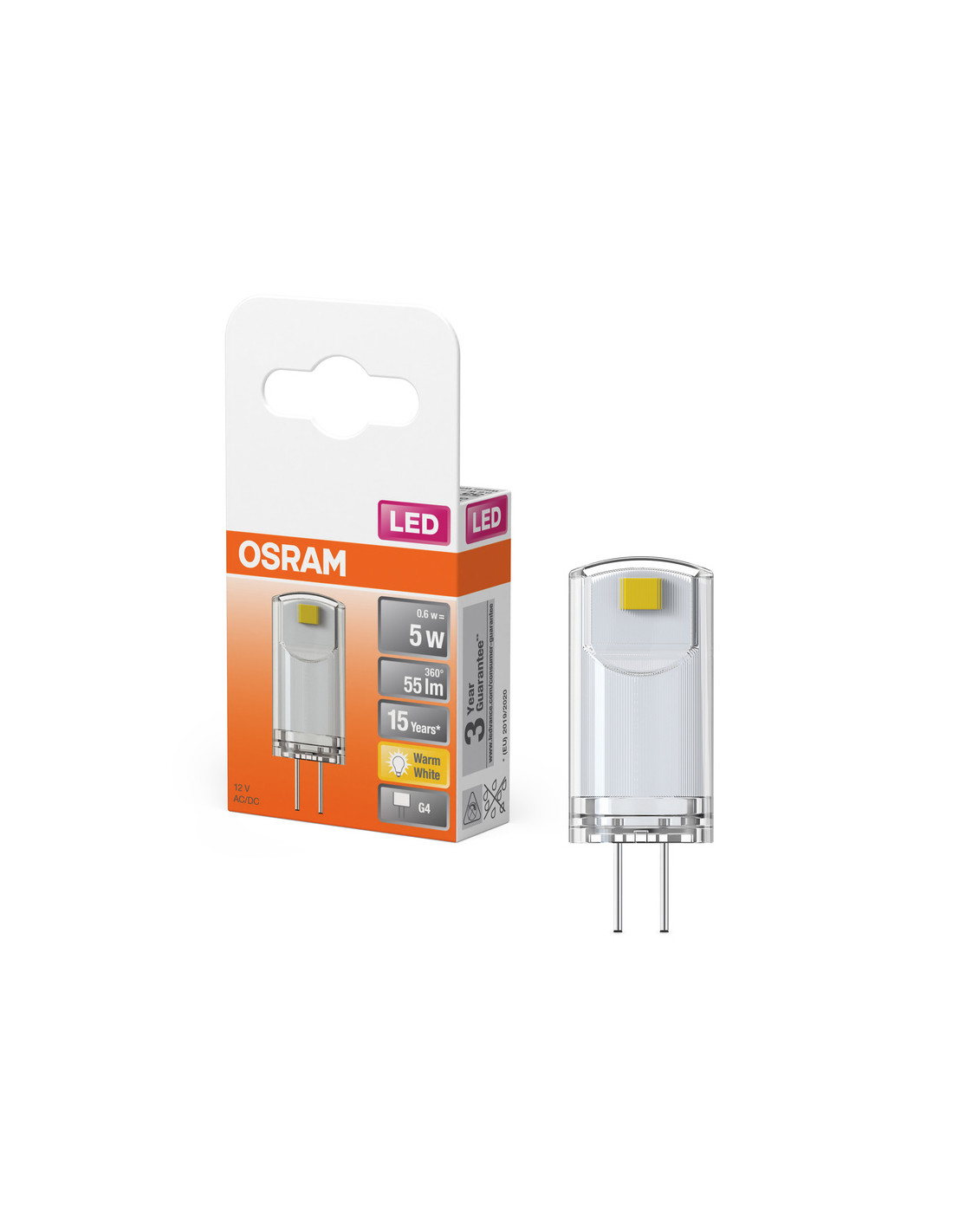 Cechy produktu: Zgodność z wieloma konwencjonalnymi i elektronicznymi zasilaczami (patrz również compatibility list). Zamiennik LED dla niskonapięciowych żarówek halogenowych. Trzonek: G4, GY6.35. Zalety produktu: Praca alternatywnie z zasilaniem prądem stałym lub przemiennym. Równomierny rozsył światła we wszystkich kierunkach. Idealne do zastosowania dekoracyjnego oraz do eksploatacji bez oprawy. Długa trwałość do 15 000 godzin. 3-letnia gwarancja. Niższe zużycie energii w porównaniu do lamp żarowych lub halogenowych. Obszary zastosowań: Zastosowania dekoracyjne. Nastrojowe oświetlenie akcentujące w całym domu. Do użytku na zewnątrz tylko w odpowiednich oprawach zewnętrznych. Porady dotyczące bezpieczeństwa: Nie dotykaj lampy, jeśli jest stłuczona.. Nie wolno używać, jeśli zewnętrzne źródło światła jest uszkodzone.. Aby zapewnić pełną wydajność oświetlenia i trwałość produktu, zalecane jest demontaż szyby lub osłony oprawy oświetleniowej..