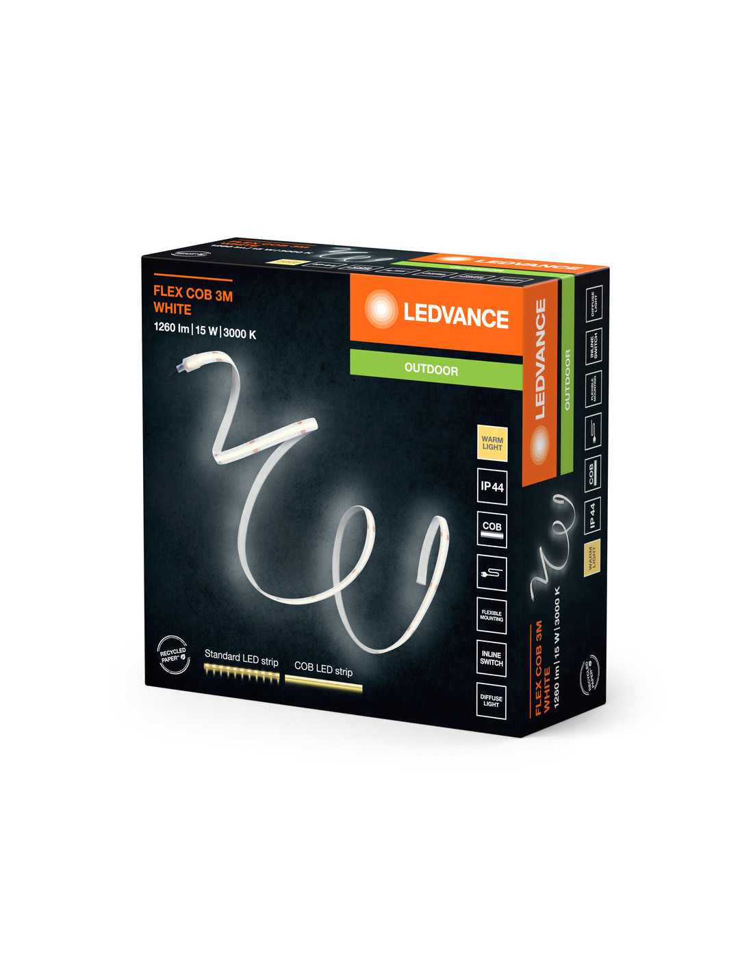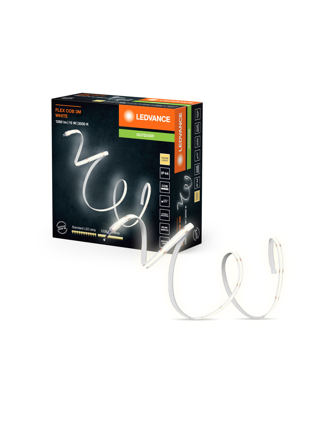 Cechy produktu: Technologia COB zapewniająca równomierny rozsył światła. Barwa światła: Warm White (ciepłobiała). Elastyczne taśmy LED, które można wyginać. Stopień ochrony: IP44. Zalety produktu: Łatwa i szybka instalacja. Równomierny rozsył strumienia świetlnego. Jednorodne oświetlenie dzięki COB LED. Obszary zastosowań: Zastosowania zewnętrzne. Oświetlenie pośrednie. Wyposażenie / Akcesoria: Kompletne akcesoria do montażu i podłączenia w zestawie. Porady dotyczące bezpieczeństwa: Aby ograniczyć ryzyko uduszenia, elastyczne przewody PODŁĄCZONE do tej oprawy należy solidnie przymocować do ściany, jeśli znajdują się w zasięgu ręki.. Nie należy włączać zasilania paska LED, gdy jest on nawinięty na szpulę. Nie należy używać paska LED, gdy jest ona przykryta lub wpuszczona w powierzchnię. Nie wolno używać paska LED w opakowaniu. Nie należy otwierać taśmy świetlnej.. Sprawdź przydatność ściany i sufitu. Jeśli nie jesteś pewien, zasięgnij profesjonalnej porady..