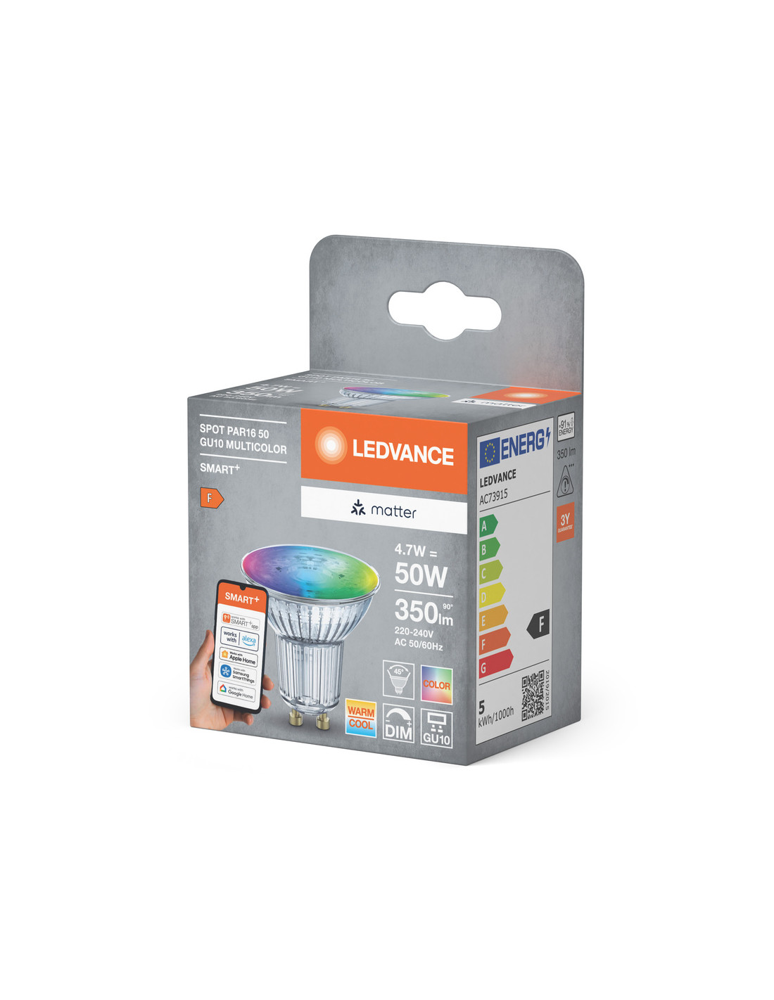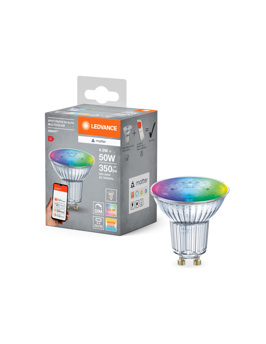 Cechy produktu: Możliwość sterowania za pomocą aplikacji SMART+ (z systemem Android w wersji co najmniej 8.0 lub iOS w wersji 14.0) lub dowolnej innej platformy zgodnej z Matter. Regulacja temperatury barwowej światła: 2700…6500 K. Sterowanie kolorami RGB. Ściemnialne. Protokół sieciowy: sprawa przez WiFi. Trwałość: do 20 000 h. Kompatybilny z Alexą, Google Home, Apple Home i innymi platformami kompatybilnymi z Matter. Zalety produktu: Sterowanie bezprzewodowe za pomocą aplikacji lub głosu. Bezproblemowa integracja z systemami kompatybilnymi z Matter. Uproszczony proces konfiguracji dzięki standardowym, przyjaznym dla użytkownika etapom instalacji. Zwiększone bezpieczeństwo poprzez wdrożenie silnych protokołów szyfrowania i uwierzytelniania. Niższe zużycie energii w porównaniu do lamp żarowych lub halogenowych. Obszary zastosowań: Oświetlenie ogólne dzięki technologii inteligentnego domu. Zastosowania profesjonalne (hotele, bary, butiki itp.) wykorzystujące dynamiczne zmiany i efekty oświetlenia otoczenia. Gdy użytkownicy chcą mieszać i dopasowywać produkty inteligentnego domu różnych producentów. Do użytku na zewnątrz tylko w odpowiednich oprawach zewnętrznych. Porady dotyczące bezpieczeństwa: Nie dotykaj lampy, jeśli jest stłuczona.. Nie wolno używać, jeśli zewnętrzne źródło światła jest uszkodzone..