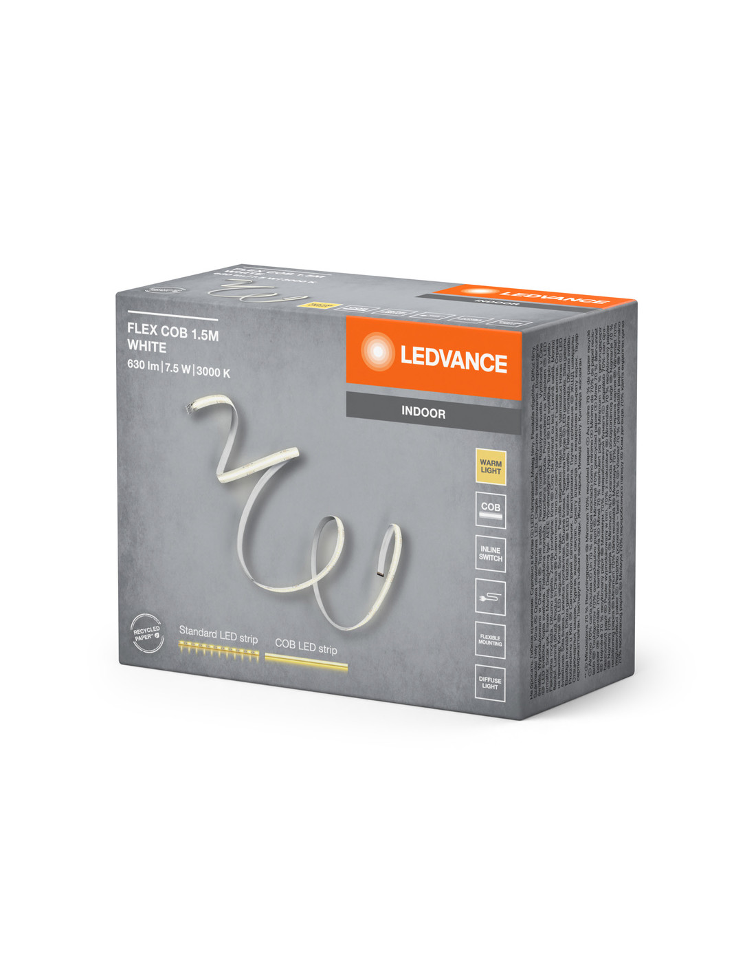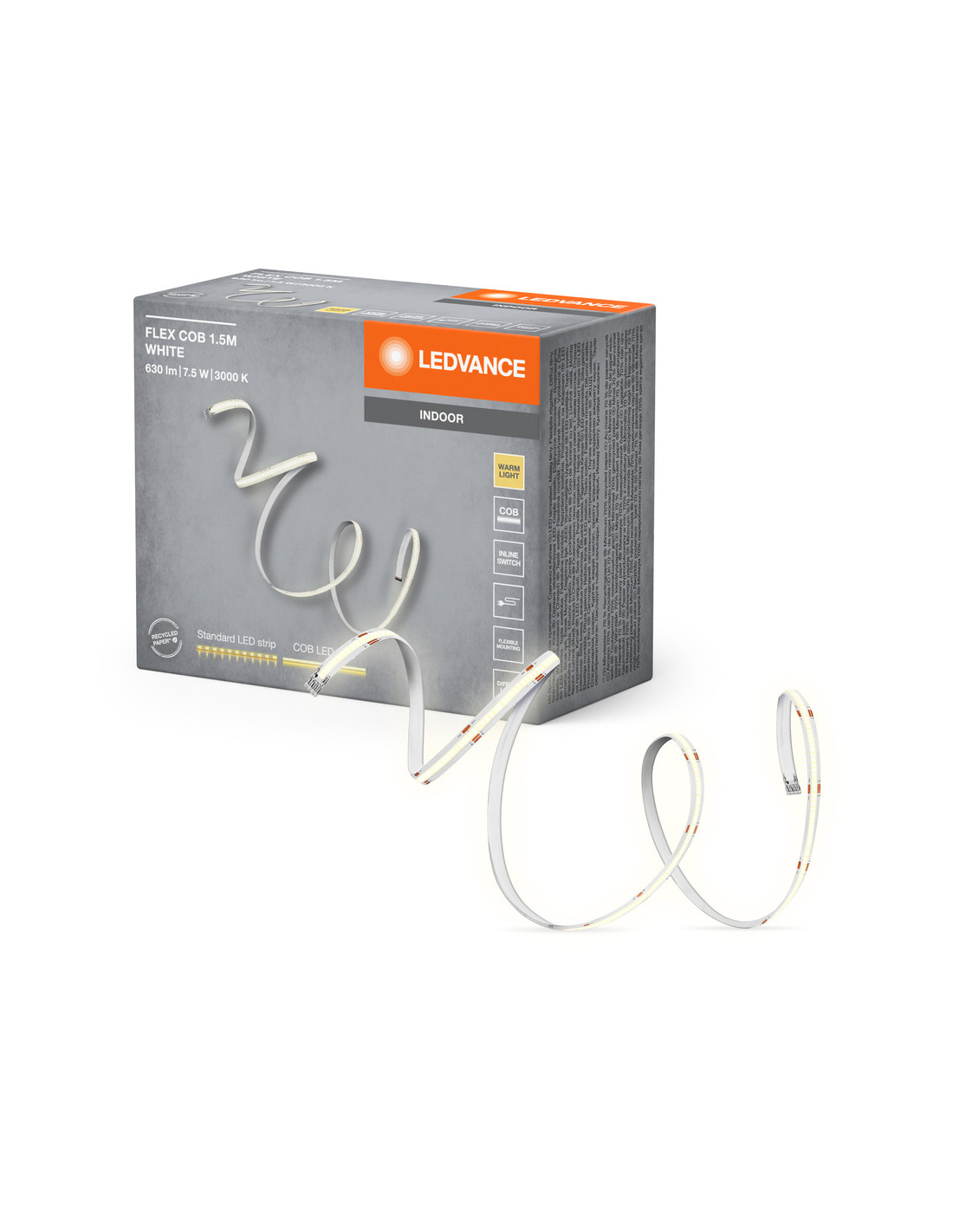Cechy produktu: Technologia COB zapewniająca równomierny rozsył światła. Barwa światła: Warm White (ciepłobiała). Elastyczne taśmy LED, które można wyginać. Zalety produktu: Łatwa i szybka instalacja. Jednorodne oświetlenie dzięki COB LED. Obszary zastosowań: Pomieszczenia codziennego użytku. Oświetlenie pośrednie. Wyposażenie / Akcesoria: Kompletne akcesoria do montażu i podłączenia w zestawie. Porady dotyczące bezpieczeństwa: Aby ograniczyć ryzyko uduszenia, elastyczne przewody PODŁĄCZONE do tej oprawy należy solidnie przymocować do ściany, jeśli znajdują się w zasięgu ręki..