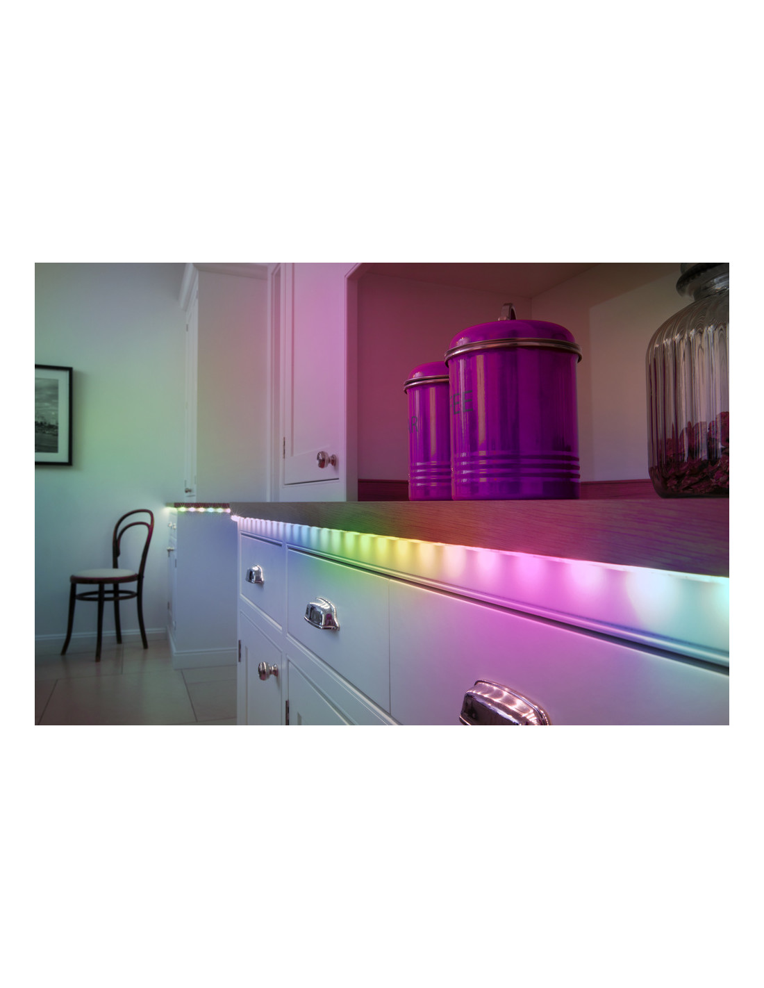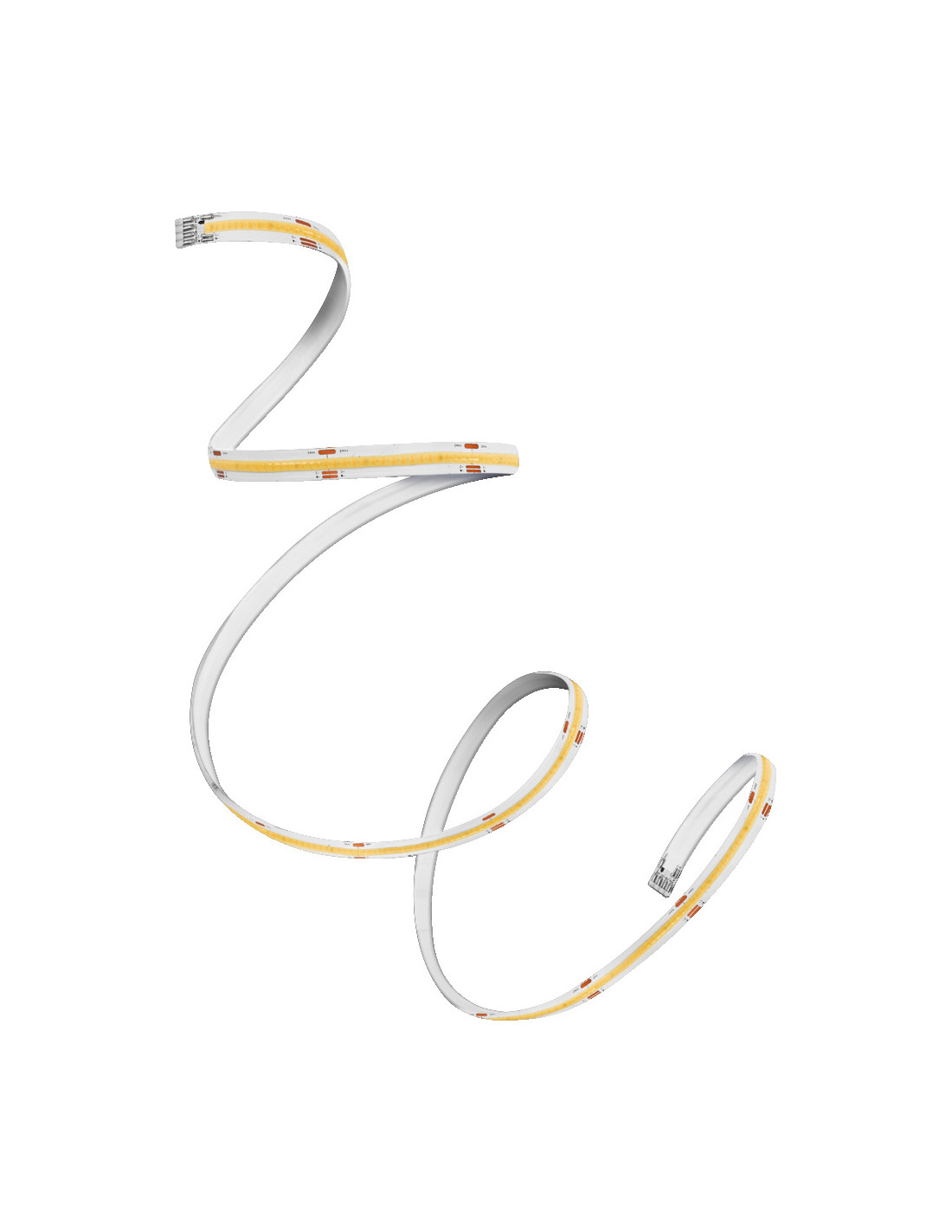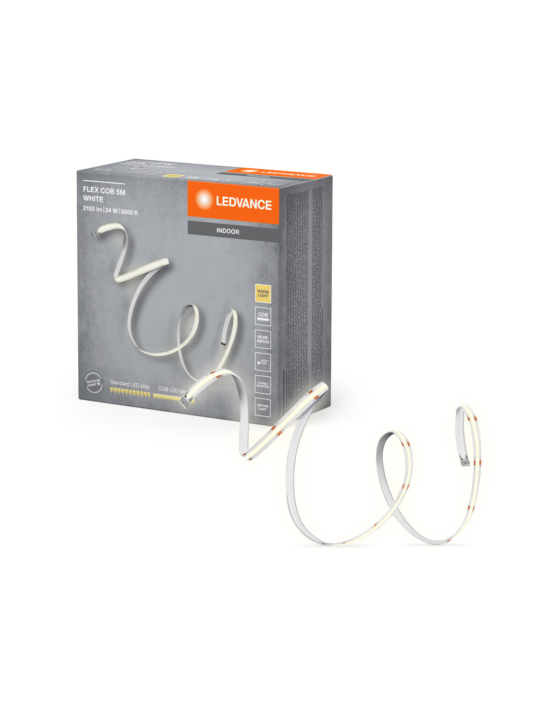 Cechy produktu: Technologia COB zapewniająca równomierny rozsył światła. Barwa światła: Warm White (ciepłobiała). Elastyczne taśmy LED, które można wyginać. Zalety produktu: Łatwa i szybka instalacja. Jednorodne oświetlenie dzięki COB LED. Obszary zastosowań: Pomieszczenia codziennego użytku. Oświetlenie pośrednie. Wyposażenie / Akcesoria: Kompletne akcesoria do montażu i podłączenia w zestawie. Porady dotyczące bezpieczeństwa: Aby ograniczyć ryzyko uduszenia, elastyczne przewody PODŁĄCZONE do tej oprawy należy solidnie przymocować do ściany, jeśli znajdują się w zasięgu ręki..
