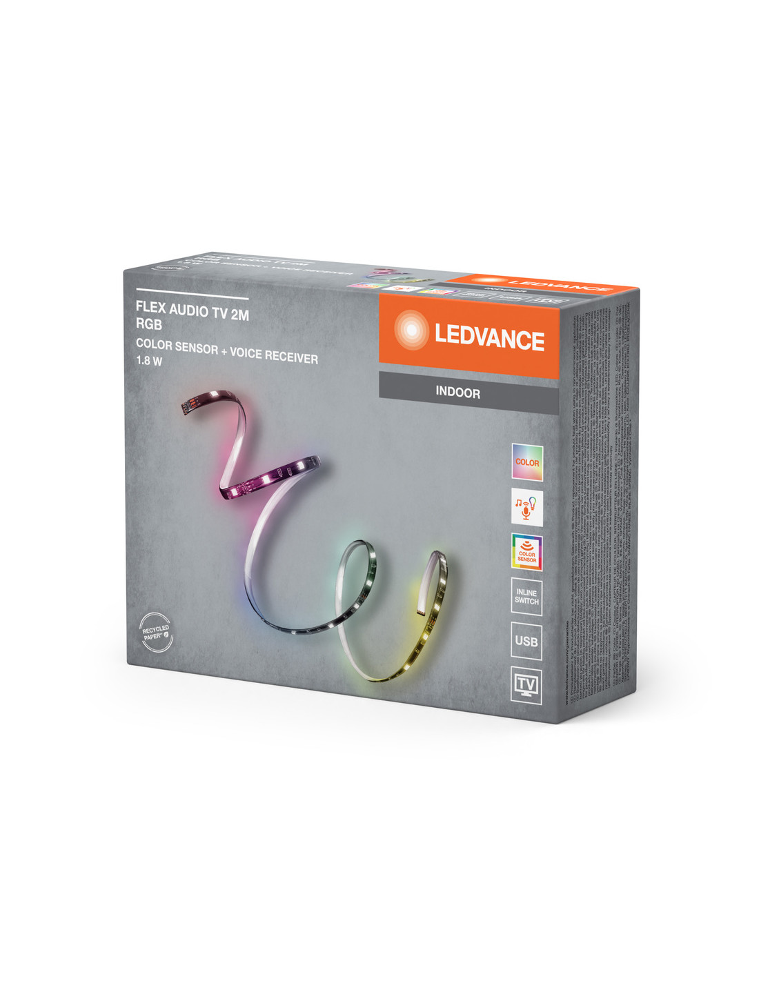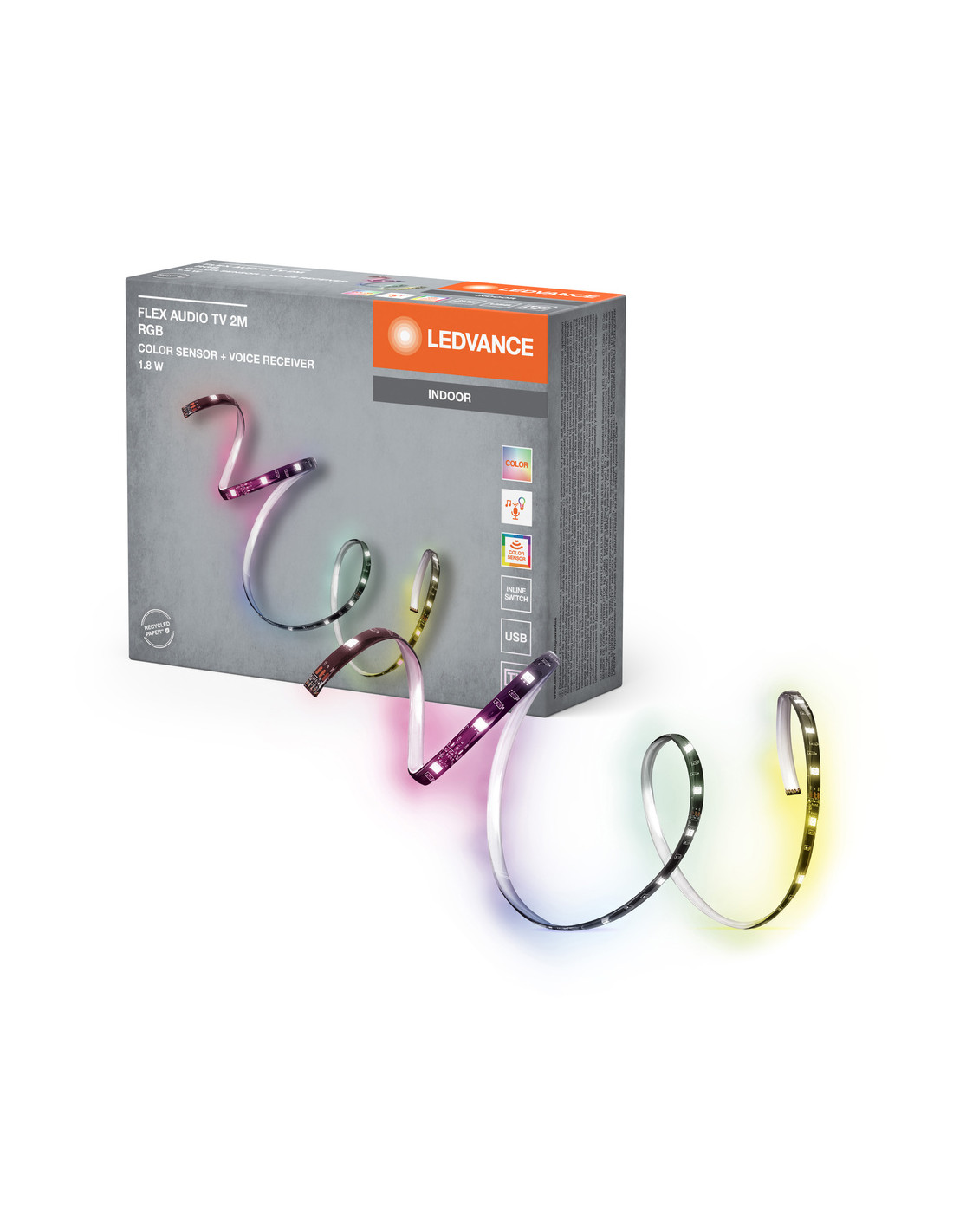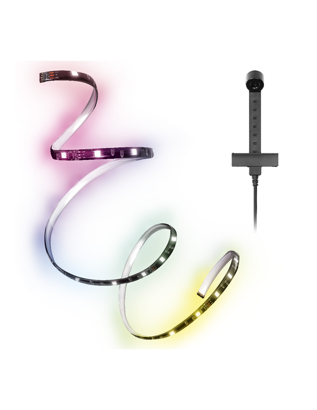 Cechy produktu: Regulacja RGB. Połączenie USB. Czujnik barwy światła dopasowujący barwę wytwarzanego światła do ekranu. Za pomocą zintegrowanych odbiorników głosowych oprawa reaguje na dźwięk i muzykę. Zalety produktu: Łatwa i szybka instalacja. Obszary zastosowań: Pomieszczenia codziennego użytku. Oświetlenie pośrednie. Wyposażenie / Akcesoria: Kompletne akcesoria do montażu i podłączenia w zestawie. Porady dotyczące bezpieczeństwa: Aby ograniczyć ryzyko uduszenia, elastyczne przewody PODŁĄCZONE do tej oprawy należy solidnie przymocować do ściany, jeśli znajdują się w zasięgu ręki.. Nie należy włączać zasilania paska LED, gdy jest on nawinięty na szpulę. Nie należy używać paska LED, gdy jest ona przykryta lub wpuszczona w powierzchnię. Nie wolno używać paska LED w opakowaniu. Nie należy otwierać taśmy świetlnej..