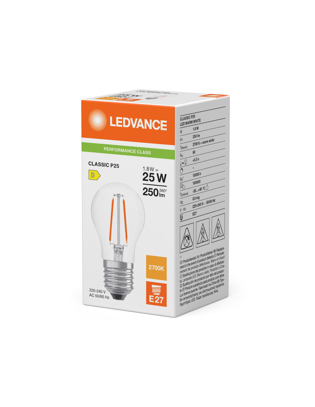 Cechy produktu: Profesjonalne lampy dla napięcia sieciowego. Kąt wiązki światła: do 300°. Brak możliwości regulacji strumienia świetlnego. Trwałość do 15 000 h. Lampa wykonana ze szkła. Dobra jakość światła, wskaźnik oddawania barw Ra: 80; stała chromatyczność. Zalety produktu: Lampy wyposażone w innowacyjną technologię „włókien” LED. Wygląd, wymiary i strumień świetlny porównywalne z tradycyjnymi żarówkami lub żarówkami halogenowymi. Niższe zużycie energii w porównaniu do lamp żarowych lub halogenowych. Brak promieniowania UV i podczerwonego w wiązce światła. Natychmiast 100 % światła, bez czasu nagrzewania. Łatwy montaż zamiast zwykłych żarówek. Obszary zastosowań: Doskonałe rozwiązanie do instalacji dekoracyjnych. Zastosowania domowe. Oświetlenie ogólne. Do użytku na zewnątrz tylko w odpowiednich oprawach zewnętrznych. Porady dotyczące bezpieczeństwa: Nie dotykaj lampy, jeśli jest stłuczona.. Nie wolno używać, jeśli zewnętrzne źródło światła jest uszkodzone..