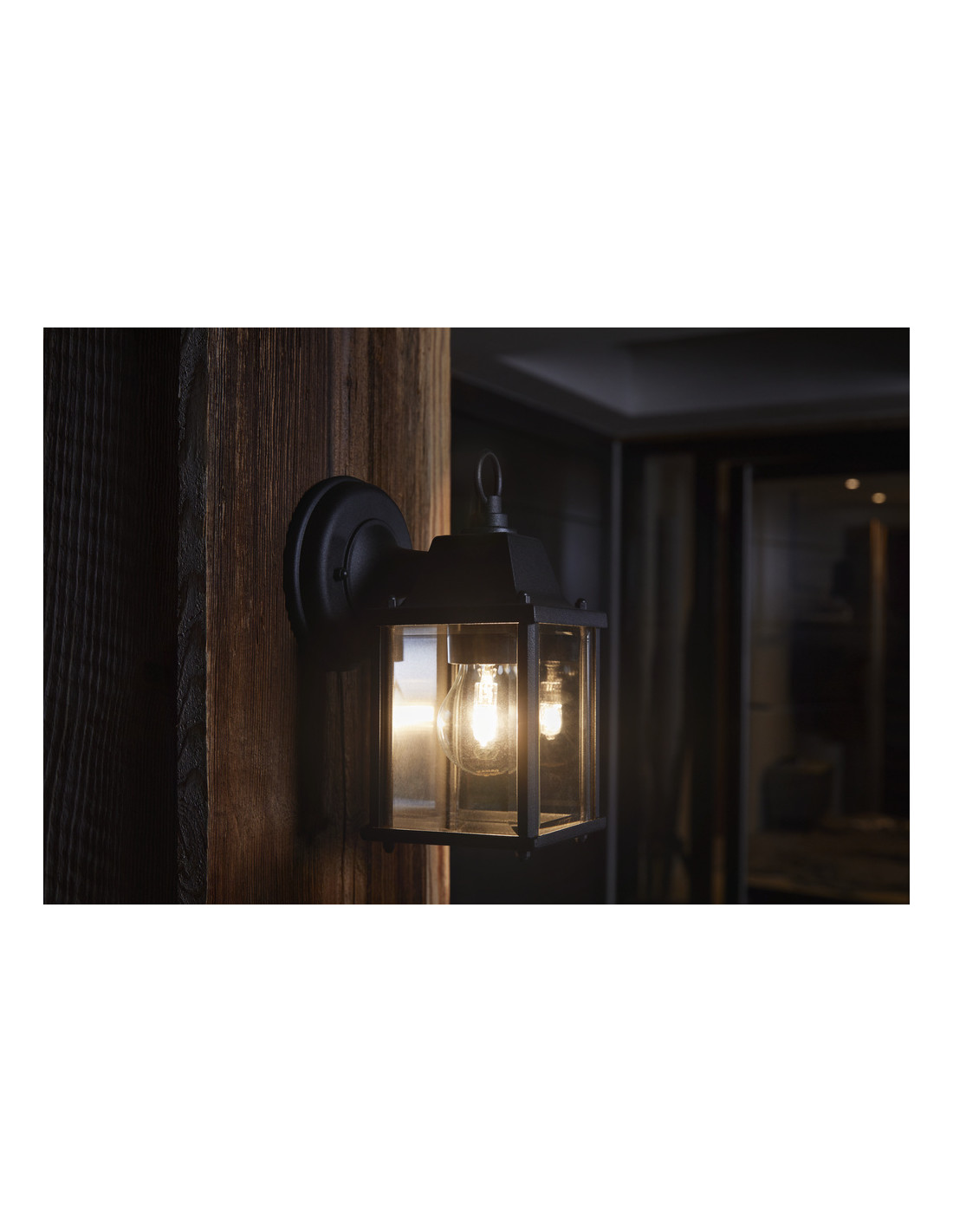 Model Square S to mniejszy wariant z serii ENDURA Classic Lantern, dzięki czemu dobrze sprawdza się tam, gdzie liczy się estetyka i oszczędność miejsca. Obudowa została wykonana z aluminium w czarnym kolorze, a przezroczysty szklany klosz podkreśla dekoracyjny charakter lampy i efektownie eksponuje źródło światła.