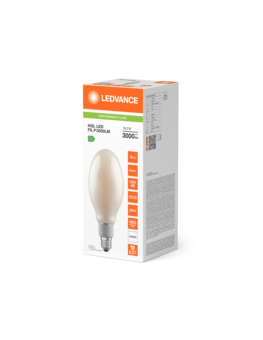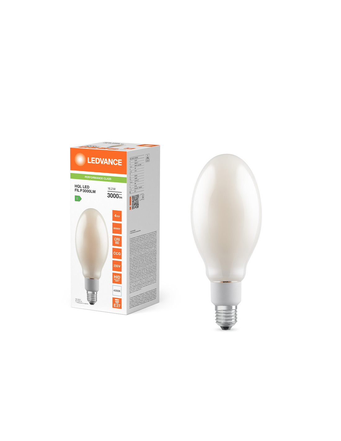 Cechy produktu: Zamiennik lamp rtęciowych HQL: nadaje się do zasilania przez tradycyjny statecznik magnetyczny (CCG) do lamp HQL lub bezpośrednio z sieci 230 V. Bardzo wysoka skuteczność świetlna 185 lm/W. Współczynnik mocy: 0,9. Stopień ochrony: IP65. Wysoka ochrona przed przepięciem: do 4 kV (L-N). Bardzo szeroki zakres temperatur otoczenia -20...+60 °C. Zalety produktu: Taka sama konstrukcja jak tradycyjne lampy HQL z matową, elipsoidalną, w pełni szklaną bańką. Pozwala zaoszczędzić do 82 % energii w przypadku zastąpienia lamp rtęciowych (HQL). Pełne wykorzystanie odbłyśnika w istniejącej oprawie oświetleniowej dzięki kątowi świecenia 360 stopni. Bardzo lekki produkt. Niski koszt konserwacji dzięki długiej trwałości. Natychmiast 100 % światła, bez czasu nagrzewania. Obszary zastosowań: Ulice. Oświetlenie przestrzeni. Strefy dla pieszych. Parki. Zastosowania zewnętrzne - tylko w odpowiednich oprawach. Porady dotyczące bezpieczeństwa: Nie nadaje się do pracy z zapłonnikami.. Zastosowanie kondensatora może doprowadzić do obniżenia współczynnika mocy systemu.. W przypadku montażu poziomego punkt tc lampy powinien znajdować się w górnej części lampy.. Zastosowanie w małych i wąskich oprawach z wąskimi odbłyśnikami nie jest rekomendowane. Nadaje się tylko do temperatur do 60 °C wewnątrz oprawy. Nie zaleca się stosowania w małych oprawach i oprawach z małymi reflektorami.. Wszystkie podłączenia elektryczne muszą być wykonane przez osobę wykwalifikowaną..