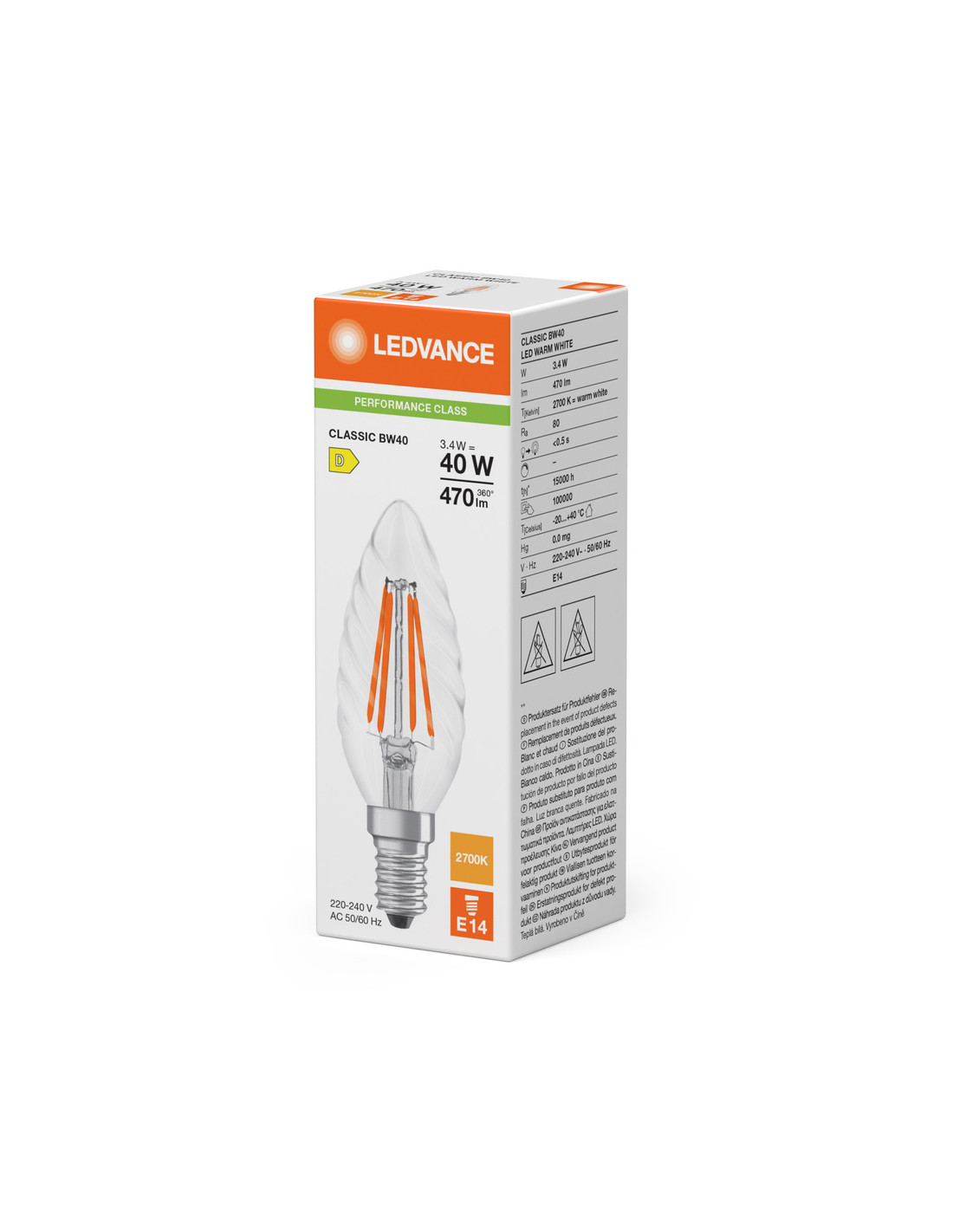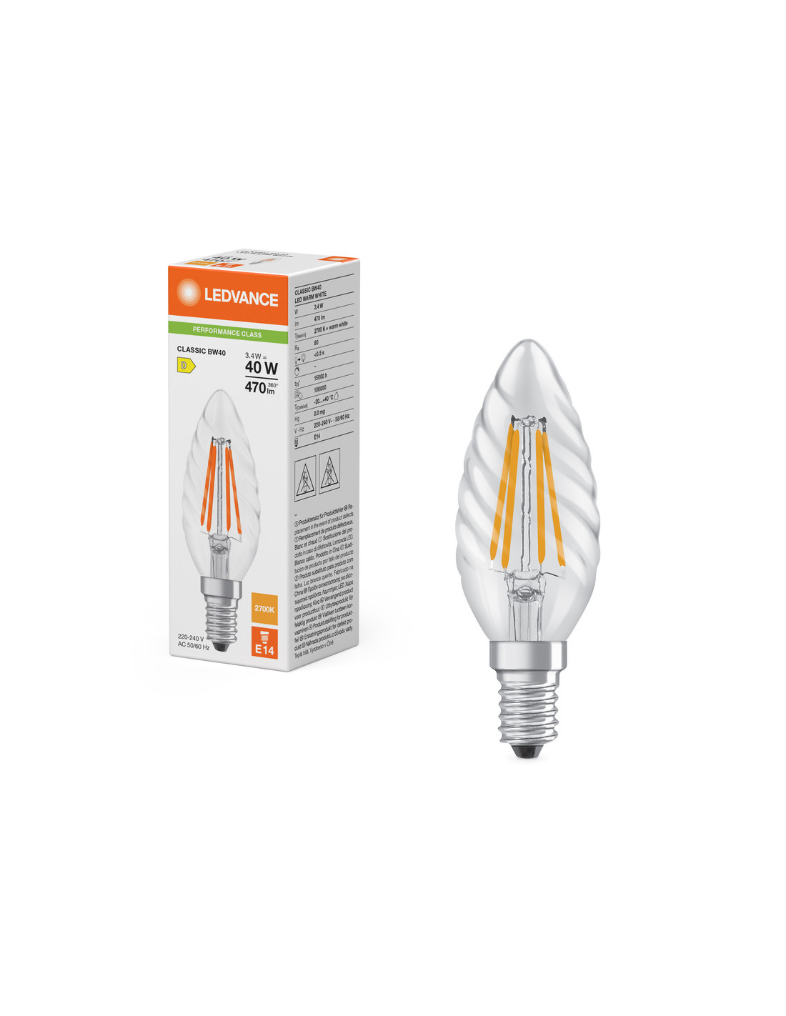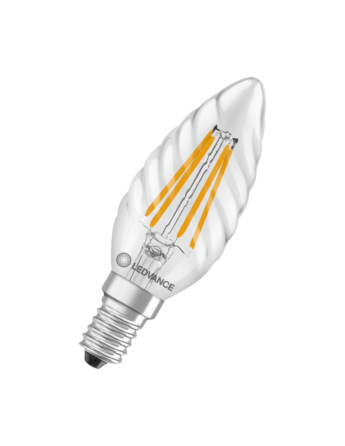 Cechy produktu: Profesjonalne lampy dla napięcia sieciowego. Kąt wiązki światła: do 300°. Brak możliwości regulacji strumienia świetlnego. Trzonek: E14. Trwałość do 15 000 h. Lampa wykonana ze szkła. Dobra jakość światła, wskaźnik oddawania barw Ra: 80; stała chromatyczność. Zalety produktu: Lampy wyposażone w innowacyjną technologię „włókien” LED. Wygląd, wymiary i strumień świetlny porównywalne z tradycyjnymi żarówkami lub żarówkami halogenowymi. Brak promieniowania UV i podczerwonego w wiązce światła. Natychmiast 100 % światła, bez czasu nagrzewania. Łatwy montaż zamiast zwykłych żarówek. Niskie obciążenie cieplne (w porównaniu ze standardowym produktem referencyjnym). Niższe zużycie energii w porównaniu do lamp żarowych lub halogenowych. Obszary zastosowań: Doskonałe rozwiązanie do instalacji dekoracyjnych. Zastosowania domowe. Oświetlenie ogólne. Do użytku na zewnątrz tylko w odpowiednich oprawach zewnętrznych. Porady dotyczące bezpieczeństwa: Nie dotykaj lampy, jeśli jest stłuczona.. Nie wolno używać, jeśli zewnętrzne źródło światła jest uszkodzone..
