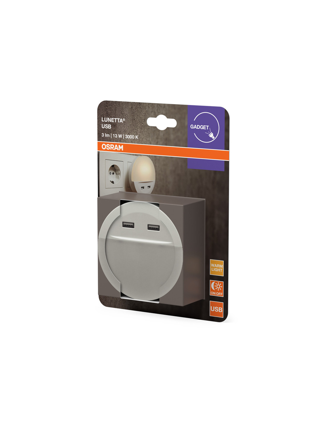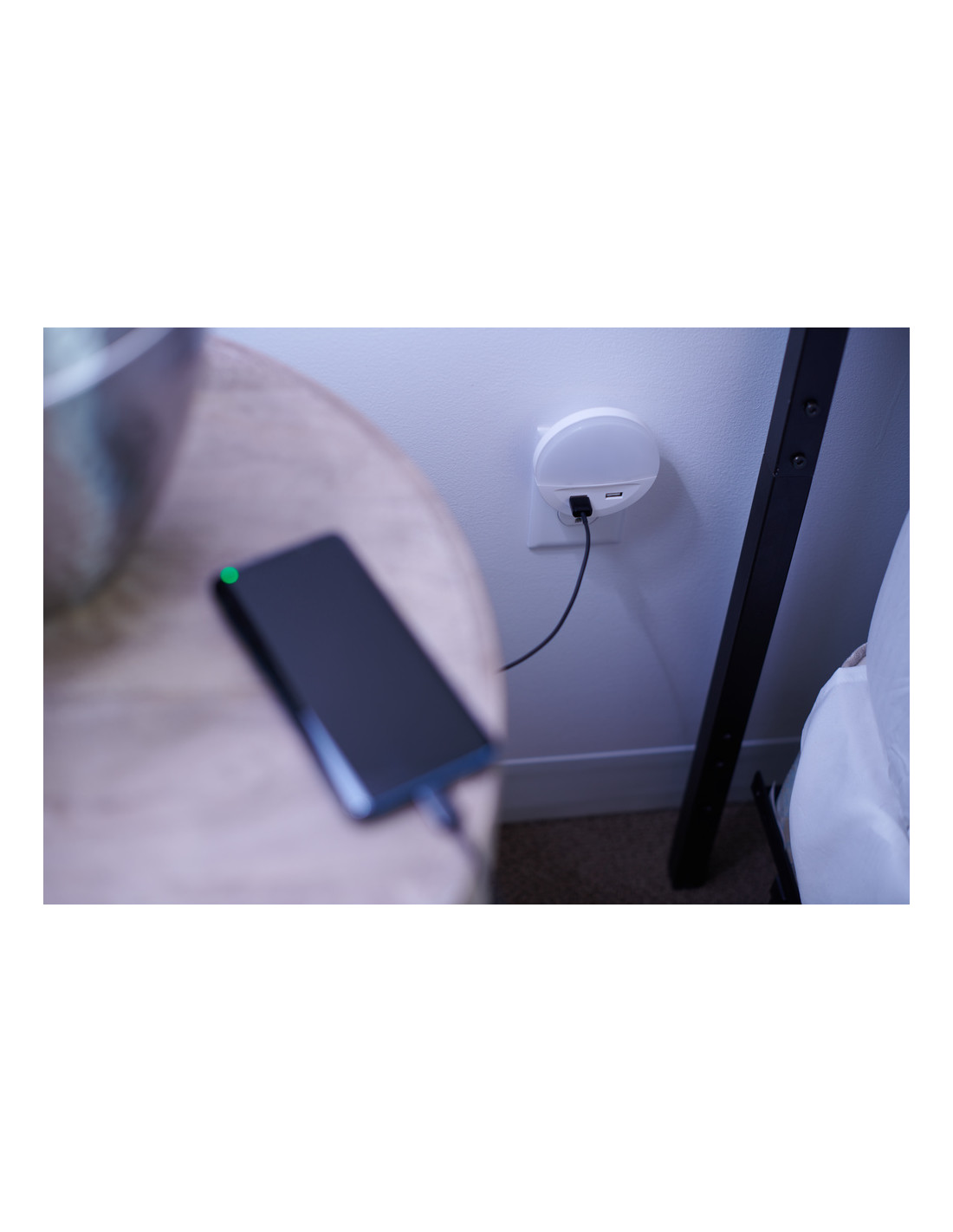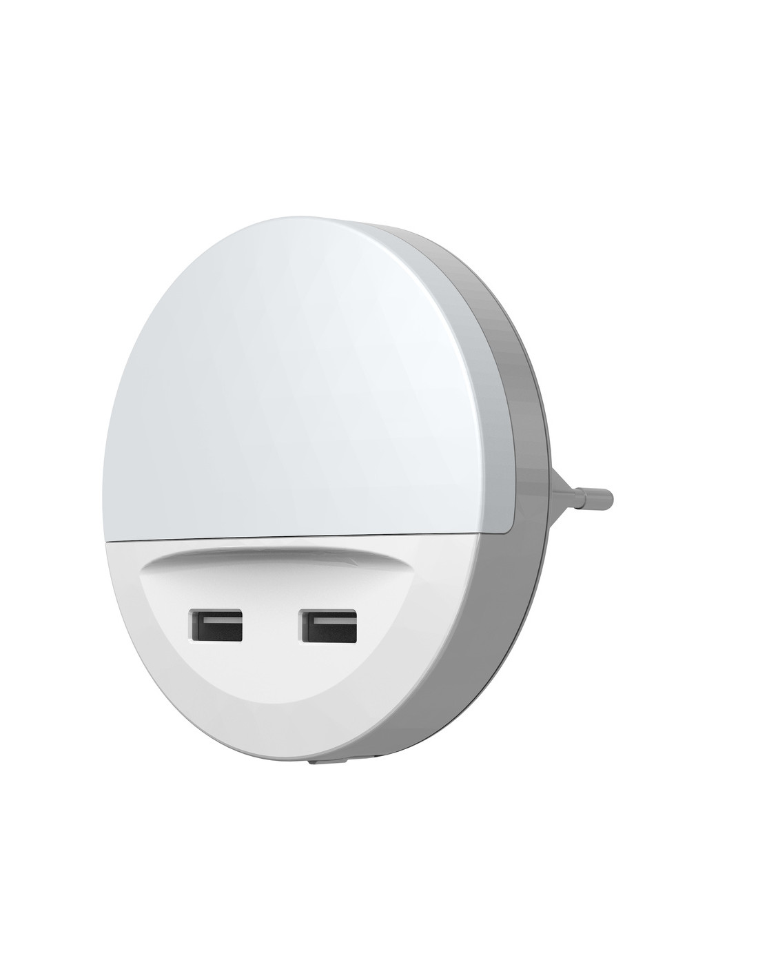 Cechy produktu: Port micro USB z funkcją ładowania. Możliwość zintegrowania stacji dokującej telefonu z tyłu. Wbudowany czujnik światła dziennego/nocnego. Zalety produktu: Automatyczne włączanie i wyłączanie w zależności od ilości dostępnego światła dziennego. Plug and Play dzięki EU Plug. Wydajne energetycznie dzięki technologii LED. Obszary zastosowań: Sypialnie. Pokoje dziecięce. Eksploatacja tylko w pomieszczeniach. Porady dotyczące bezpieczeństwa: Ten produkt nie jest zabawką. Nie powinien być pozostawiany bez nadzoru w rękach dzieci ani obsługiwany przez dzieci.. Nie jest przeznaczony do zastępowania tradycyjnego oświetlenia w gospodarstwach domowych..