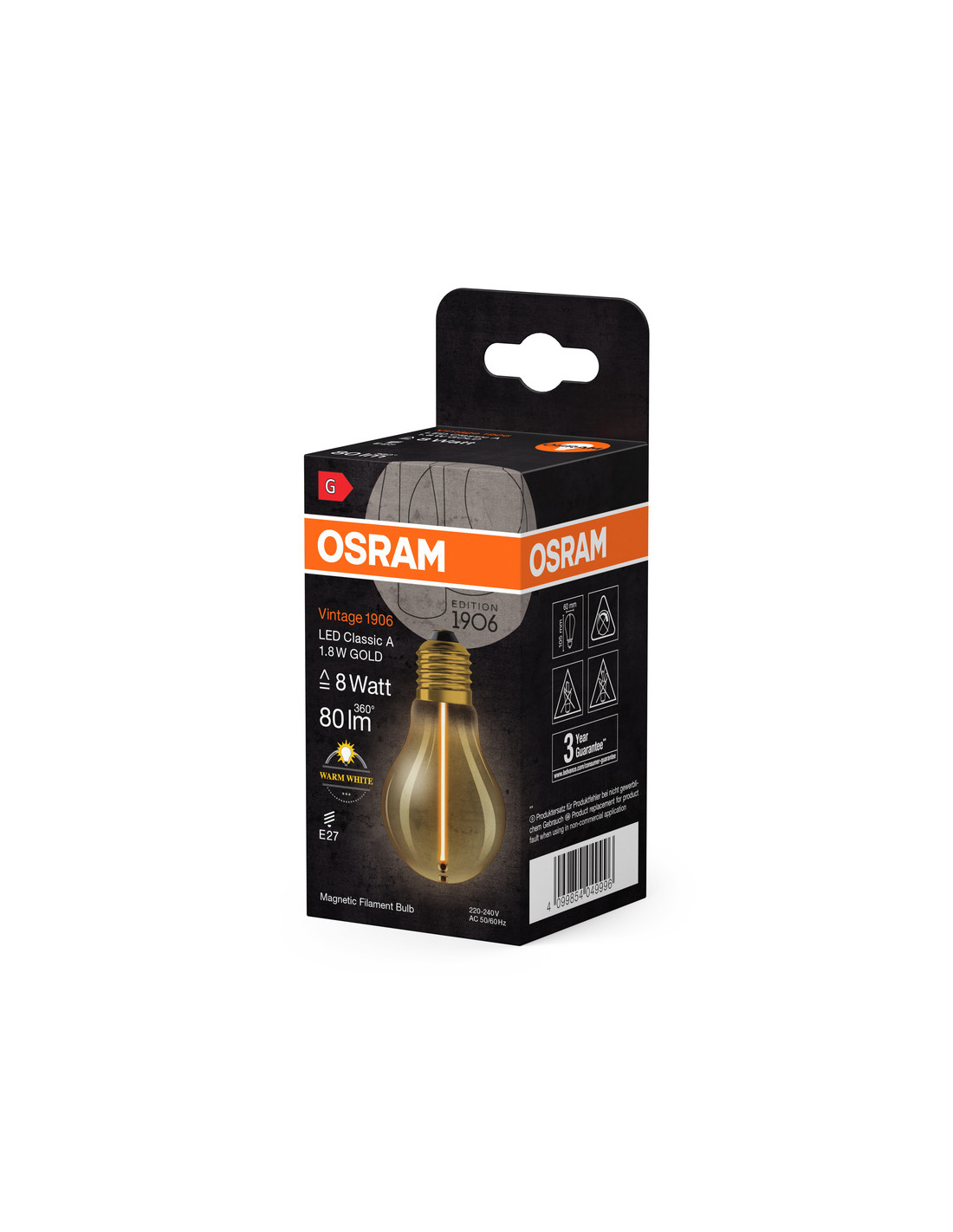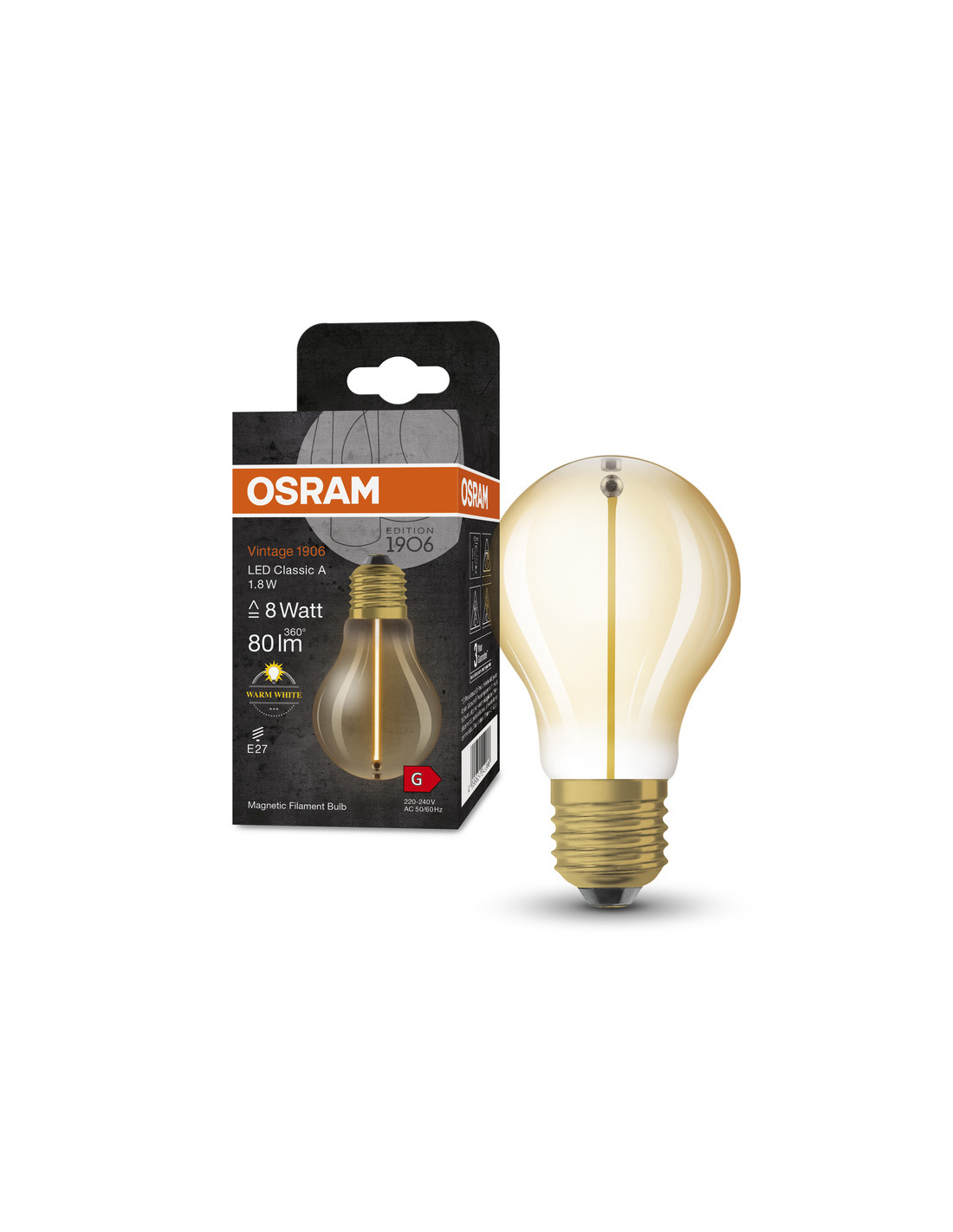 Cechy produktu: Trwałość do 15 000 h. Dobra jakość światła, wskaźnik oddawania barw Ra: 80; stała chromatyczność. Lampa wykonana ze szkła. Dostępna w temperaturach barwowych: 2700 K, 1800 K. Przyjemne światło: ciepłobiała barwa światła. Zalety produktu: Niższe zużycie energii w porównaniu do lamp żarowych lub halogenowych. Natychmiast 100 % światła, bez czasu nagrzewania. Łatwy montaż zamiast zwykłych żarówek. Stopień ochrony: IP20, Idealny do użytku w pomieszczeniach zamkniętych. Lampy dekoracyjne wykorzystujące innowacyjną technologię LED „filament-magnetic”.. Brak uchwytu na żarnik: Idealny do instalacji dekoracyjnych. Dostępne różne kształty i średnice baniek. Obszary zastosowań: Doskonałe rozwiązanie do instalacji dekoracyjnych. Zastosowania domowe. Oświetlenie ogólne. Do użytku na zewnątrz tylko w odpowiednich oprawach zewnętrznych. Porady dotyczące bezpieczeństwa: Nie dotykaj lampy, jeśli jest stłuczona.. Nie wolno używać, jeśli zewnętrzne źródło światła jest uszkodzone..