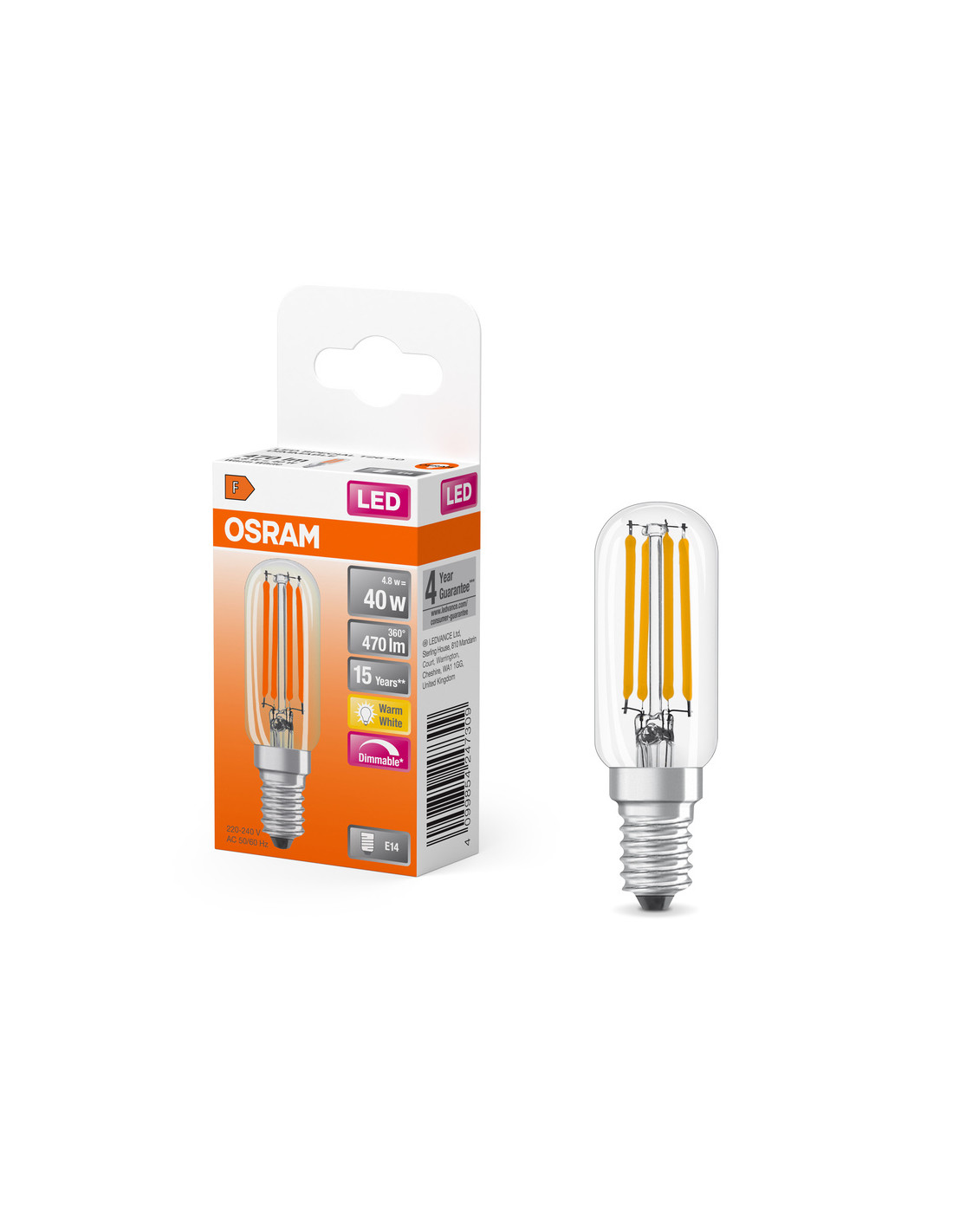 Cechy produktu: Zamienniki LED dla konwencjonalnych żarówek wysokonapięciowych. Dobra jakość światła, wskaźnik oddawania barw Ra: 80; stała chromatyczność. Zalety produktu: Wyjątkowo małe wymiary. Równomierny rozsył światła we wszystkich kierunkach. Idealne do zastosowania dekoracyjnego oraz do eksploatacji bez oprawy. Długa trwałość do 15 000 godzin. 3-letnia gwarancja. Niższe zużycie energii w porównaniu do lamp żarowych lub halogenowych. Obszary zastosowań: Zamrażarki domowe. Nastrojowe oświetlenie akcentujące w całym domu. Małe oprawy designerskie. Maszyny szwalnicze. Do użytku na zewnątrz tylko w odpowiednich oprawach zewnętrznych. Porady dotyczące bezpieczeństwa: Nie dotykaj lampy, jeśli jest stłuczona.. Nie wolno używać, jeśli zewnętrzne źródło światła jest uszkodzone..