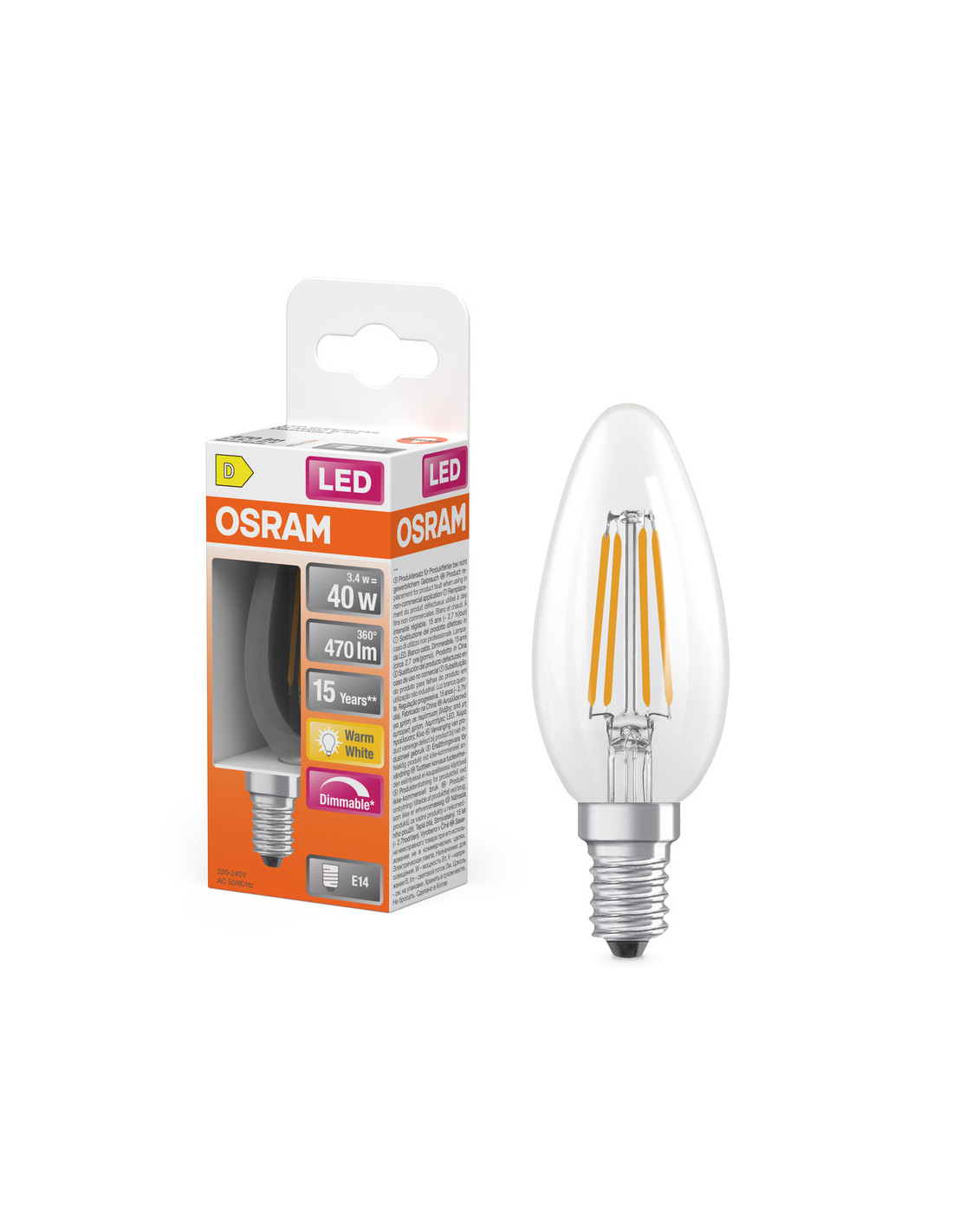 Cechy produktu: Lampy LED dla napięcia sieciowego. Ściemnialne (za pomocą licznych popularnych ściemniaczy, zobacz więcej www.ledvance.pl/dim). Kąt wiązki światła: do 300°. Trwałość do 15 000 h. Lampa wykonana ze szkła. Dobra jakość światła, wskaźnik oddawania barw Ra: 80; stała chromatyczność. Zalety produktu: Lampy wyposażone w innowacyjną technologię „włókien” LED. Niższe zużycie energii w porównaniu do lamp żarowych lub halogenowych. Natychmiast 100 % światła, bez czasu nagrzewania. Łatwy montaż zamiast zwykłych żarówek. Konstrukcja, wymiary i strumień świetlny porównywalne z tradycyjną żarówką. Obszary zastosowań: Doskonałe rozwiązanie do instalacji dekoracyjnych. Zastosowania dekoracyjne. Oświetlenie ogólne. Do użytku na zewnątrz tylko w odpowiednich oprawach zewnętrznych. Porady dotyczące bezpieczeństwa: Nie dotykaj lampy, jeśli jest stłuczona.. Nie wolno używać, jeśli zewnętrzne źródło światła jest uszkodzone..