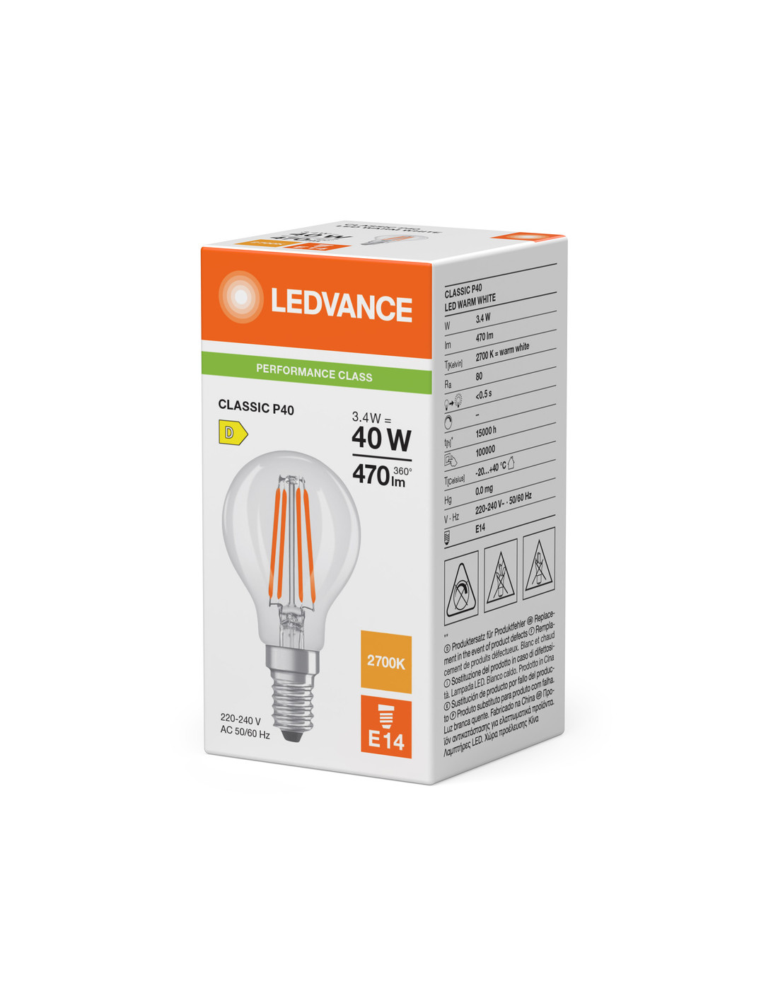 Cechy produktu: Profesjonalne lampy dla napięcia sieciowego. Kąt wiązki światła: do 300°. Brak możliwości regulacji strumienia świetlnego. Trwałość do 15 000 h. Lampa wykonana ze szkła. Dobra jakość światła, wskaźnik oddawania barw Ra: 80; stała chromatyczność. Zalety produktu: Lampy wyposażone w innowacyjną technologię „włókien” LED. Wygląd, wymiary i strumień świetlny porównywalne z tradycyjnymi żarówkami lub żarówkami halogenowymi. Niższe zużycie energii w porównaniu do lamp żarowych lub halogenowych. Brak promieniowania UV i podczerwonego w wiązce światła. Natychmiast 100 % światła, bez czasu nagrzewania. Łatwy montaż zamiast zwykłych żarówek. Obszary zastosowań: Doskonałe rozwiązanie do instalacji dekoracyjnych. Zastosowania domowe. Oświetlenie ogólne. Do użytku na zewnątrz tylko w odpowiednich oprawach zewnętrznych. Porady dotyczące bezpieczeństwa: Nie dotykaj lampy, jeśli jest stłuczona.. Nie wolno używać, jeśli zewnętrzne źródło światła jest uszkodzone..