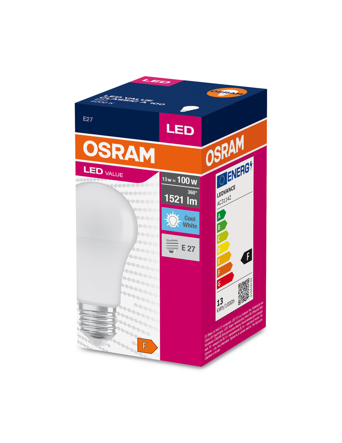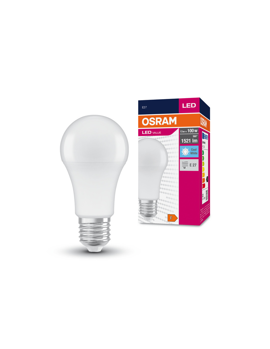 Żarówka LED OSRAM Value Classic A100 to wysokiej jakości źródło światła o mocy 13W, które z powodzeniem zastępuje tradycyjną żarówkę 100W. Dzięki klasycznemu kształtowi bańki (A60) i uniwersalnemu trzonkowi E27, stanowi idealne rozwiązanie do oświetlenia głównego w salonach, kuchniach czy pomieszczeniach biurowych.