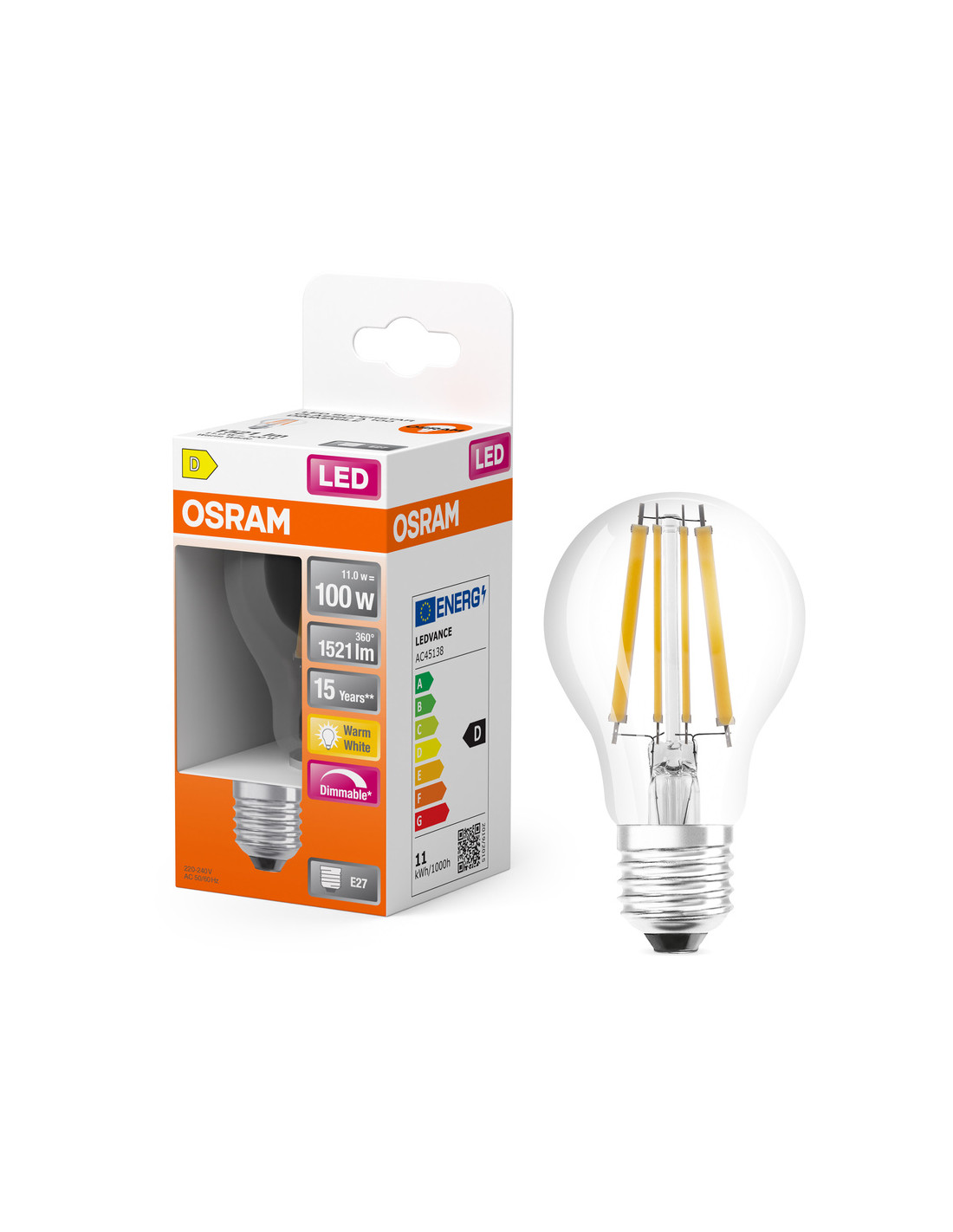 Cechy produktu: Profesjonalne lampy dla napięcia sieciowego. Ściemnialne (za pomocą licznych popularnych ściemniaczy, zobacz więcej www.ledvance.pl/dim). Kąt wiązki światła: do 360°. Trwałość do 15 000 h. Lampa wykonana ze szkła. Dobra jakość światła, wskaźnik oddawania barw Ra: 80; stała chromatyczność. Zalety produktu: Lampy wyposażone w innowacyjną technologię „włókien” LED. Niższe zużycie energii w porównaniu do lamp żarowych lub halogenowych. Brak promieniowania UV i podczerwonego w wiązce światła. Natychmiast 100 % światła, bez czasu nagrzewania. Łatwy montaż zamiast zwykłych żarówek. Niskie obciążenie cieplne (w porównaniu ze standardowym produktem referencyjnym). Wygląd, wymiary i strumień świetlny porównywalne z żarówkami halogenowymi. Obszary zastosowań: Doskonałe rozwiązanie do instalacji dekoracyjnych. Zastosowania domowe. Oświetlenie ogólne. Do użytku na zewnątrz tylko w odpowiednich oprawach zewnętrznych. Porady dotyczące bezpieczeństwa: Nie dotykaj lampy, jeśli jest stłuczona.. Nie wolno używać, jeśli zewnętrzne źródło światła jest uszkodzone..