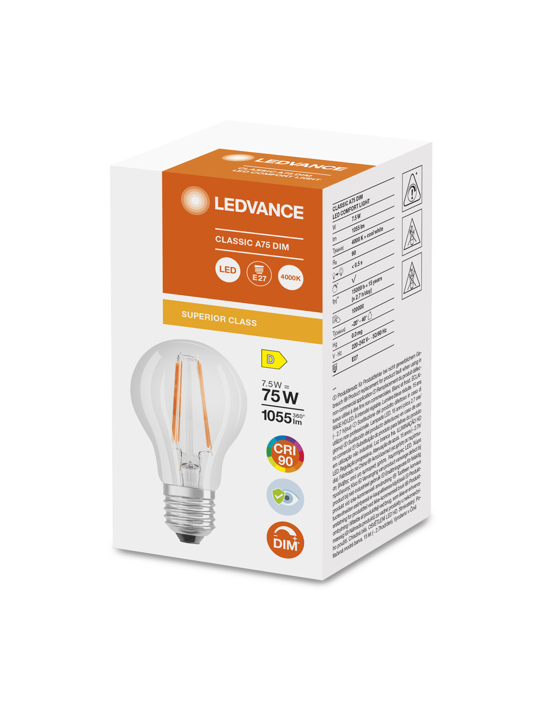 ŻARÓWKA LED COMFORT/SUPERIOR CLA75 DIM 7,5W 4000K neutralna biała CRI90 FIL E27