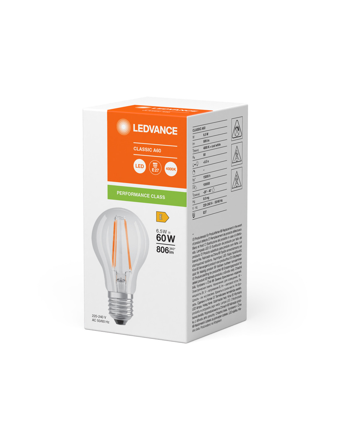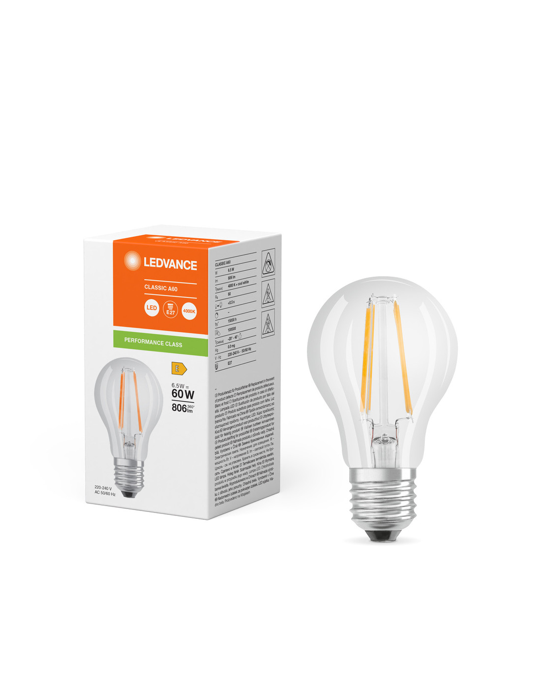 Cechy produktu: Profesjonalne lampy dla napięcia sieciowego. Kąt wiązki światła: do 300°. Brak możliwości regulacji strumienia świetlnego. Trzonek: E27. Trwałość do 15 000 h. Lampa wykonana ze szkła. Dobra jakość światła, wskaźnik oddawania barw Ra: 80; stała chromatyczność. Zalety produktu: Lampy wyposażone w innowacyjną technologię „włókien” LED. Wygląd, wymiary i strumień świetlny porównywalne z tradycyjnymi żarówkami lub żarówkami halogenowymi. Niższe zużycie energii w porównaniu do lamp żarowych lub halogenowych. Brak promieniowania UV i podczerwonego w wiązce światła. Natychmiast 100 % światła, bez czasu nagrzewania. Łatwy montaż zamiast zwykłych żarówek. Obszary zastosowań: Doskonałe rozwiązanie do instalacji dekoracyjnych. Zastosowania domowe. Oświetlenie ogólne. Do użytku na zewnątrz tylko w odpowiednich oprawach zewnętrznych. Porady dotyczące bezpieczeństwa: Nie dotykaj lampy, jeśli jest stłuczona.. Nie wolno używać, jeśli zewnętrzne źródło światła jest uszkodzone..