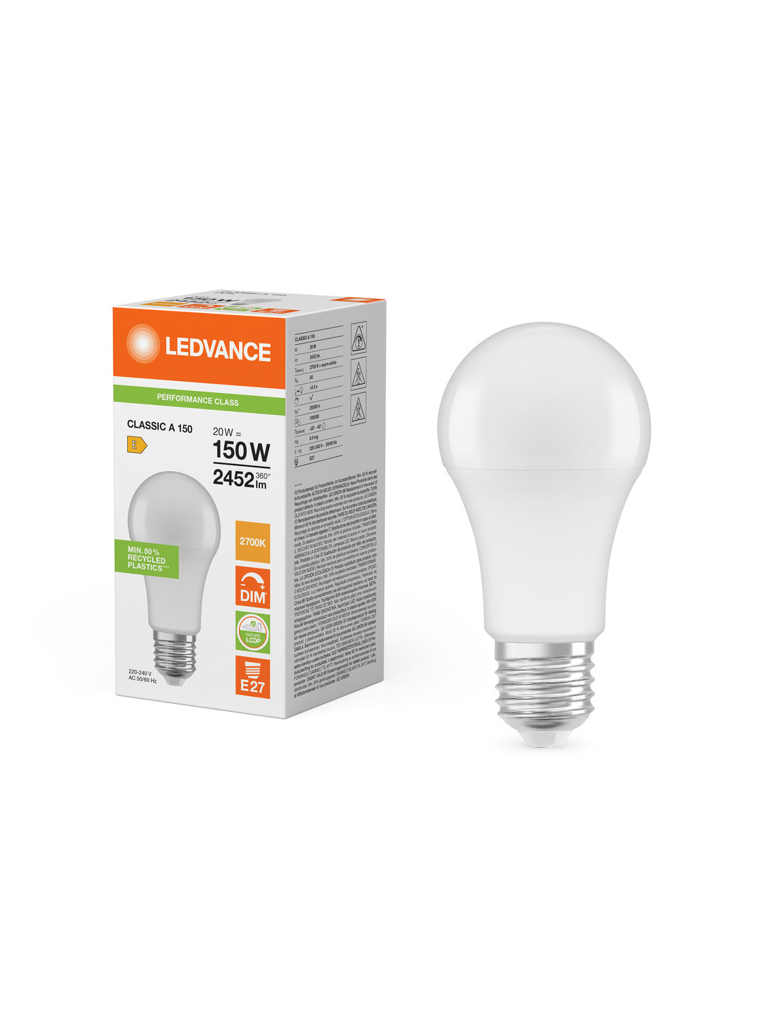 Cechy produktu: Profesjonalne lampy dla napięcia sieciowego. Ściemnialne (za pomocą licznych popularnych ściemniaczy, zobacz więcej www.ledvance.pl/dim). Użyto co najmniej 50% plastiku pochodzącego z recyklingu (w stosunku do całkowitej masy plastiku). Dobre oddawanie barw (Ra 80) i stabilność braw przez cały czas eksploatacji lampy. Zalety produktu: Niższe zużycie energii w porównaniu do lamp żarowych lub halogenowych. Wysoka spójność barw dzięki precyzyjnemu sortowaniu struktur półprzewodnikowych. Prosty w użyciu zamiennik żarówek klasycznych dzięki kompaktowej konstrukcji. Wykonana z tworzyw sztucznych pochodzących z recyklingu lampa przyczynia się do ograniczenia emisji CO2 i ilości odpadów składowanych na wysypiskach. Obszary zastosowań: Zastosowania domowe. Oświetlenie ogólne. Do użytku na zewnątrz tylko w odpowiednich oprawach zewnętrznych. Porady dotyczące bezpieczeństwa: Nie dotykaj lampy, jeśli jest stłuczona.. Nie wolno używać, jeśli zewnętrzne źródło światła jest uszkodzone..