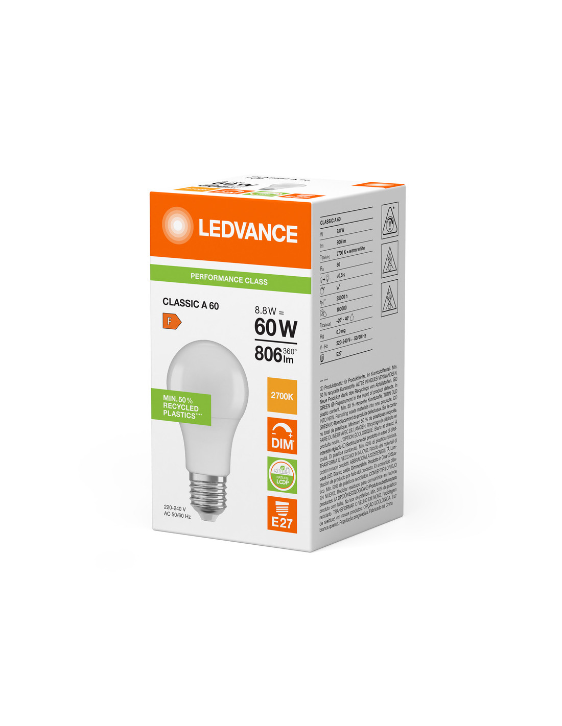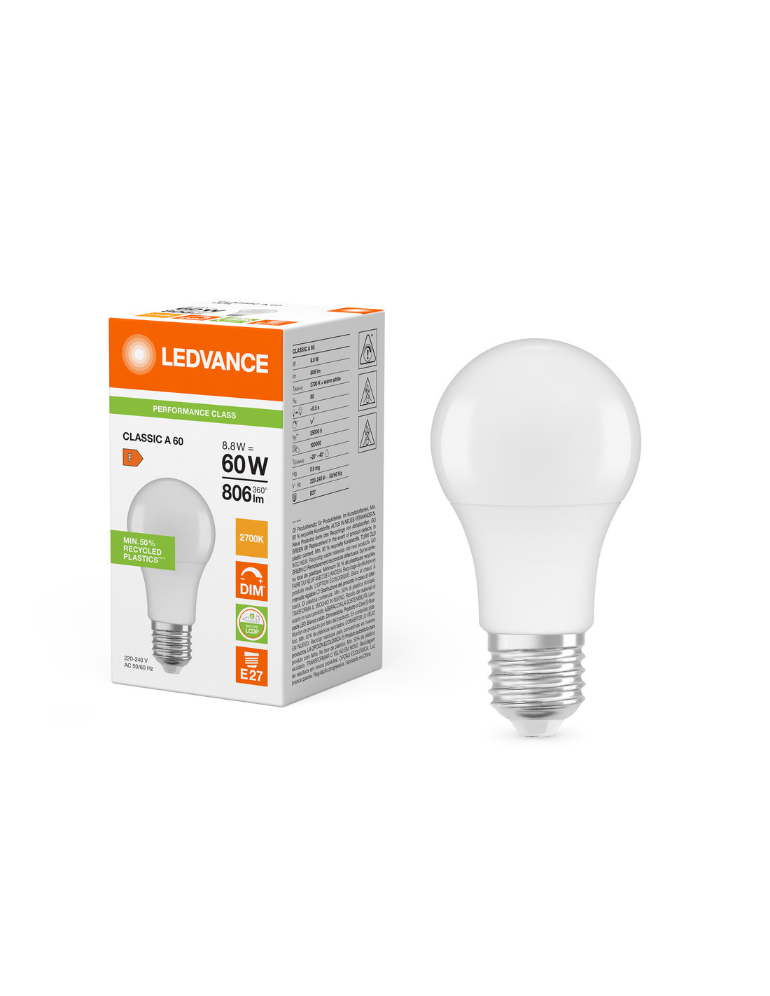 Cechy produktu: Profesjonalne lampy dla napięcia sieciowego. Ściemnialne (za pomocą licznych popularnych ściemniaczy, zobacz więcej www.ledvance.pl/dim). Użyto co najmniej 50% plastiku pochodzącego z recyklingu (w stosunku do całkowitej masy plastiku). Dobre oddawanie barw (Ra 80) i stabilność braw przez cały czas eksploatacji lampy. Zalety produktu: Niższe zużycie energii w porównaniu do lamp żarowych lub halogenowych. Wysoka spójność barw dzięki precyzyjnemu sortowaniu struktur półprzewodnikowych. Prosty w użyciu zamiennik żarówek klasycznych dzięki kompaktowej konstrukcji. Wykonana z tworzyw sztucznych pochodzących z recyklingu lampa przyczynia się do ograniczenia emisji CO2 i ilości odpadów składowanych na wysypiskach. Obszary zastosowań: Zastosowania domowe. Oświetlenie ogólne. Do użytku na zewnątrz tylko w odpowiednich oprawach zewnętrznych. Porady dotyczące bezpieczeństwa: Nie dotykaj lampy, jeśli jest stłuczona.. Nie wolno używać, jeśli zewnętrzne źródło światła jest uszkodzone..