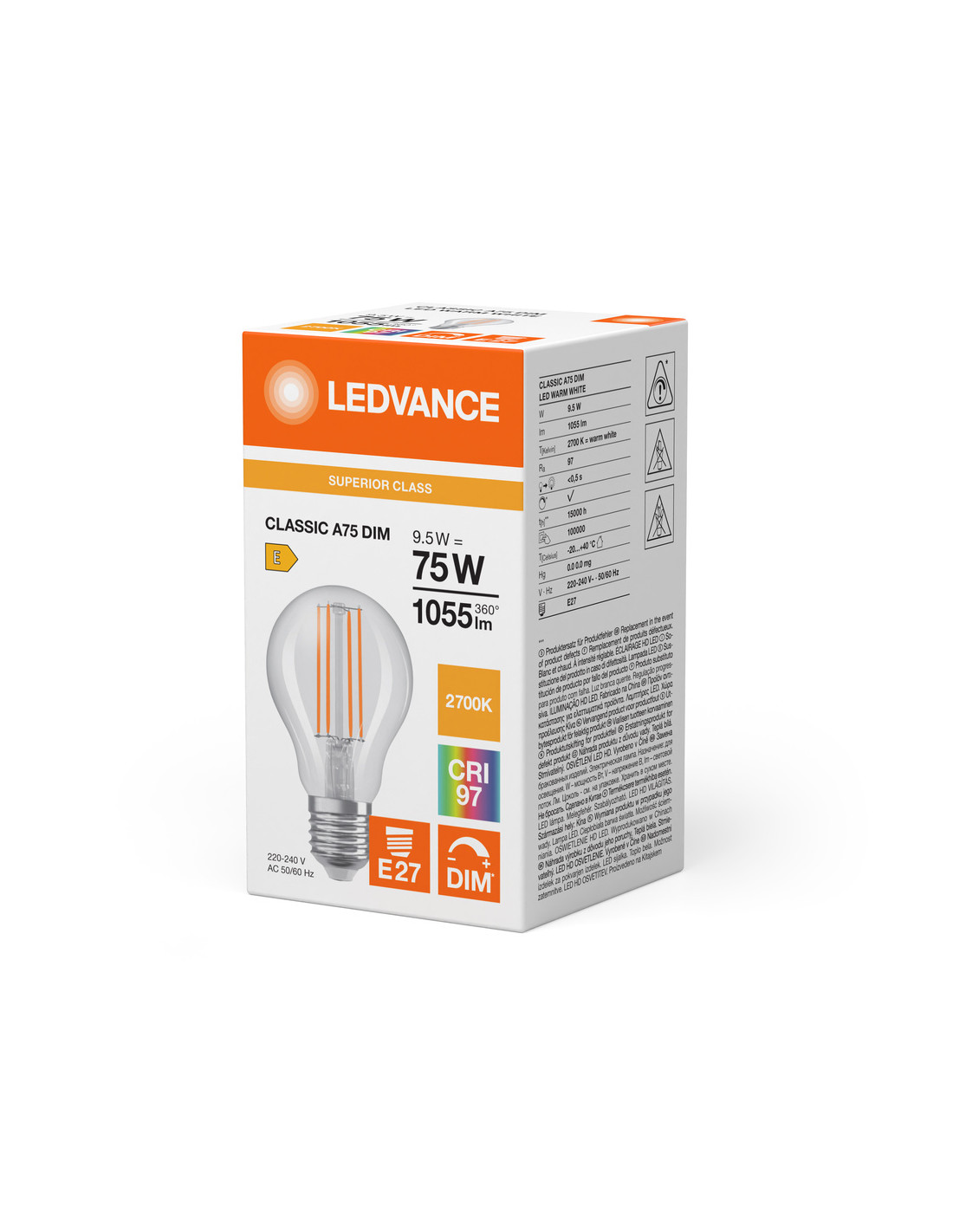 ŻARÓWKA LED S LED CLA75 DIM 9.5W 2700K ciepła biała CRI90 E27 CRI97 FIL CL 1055LM