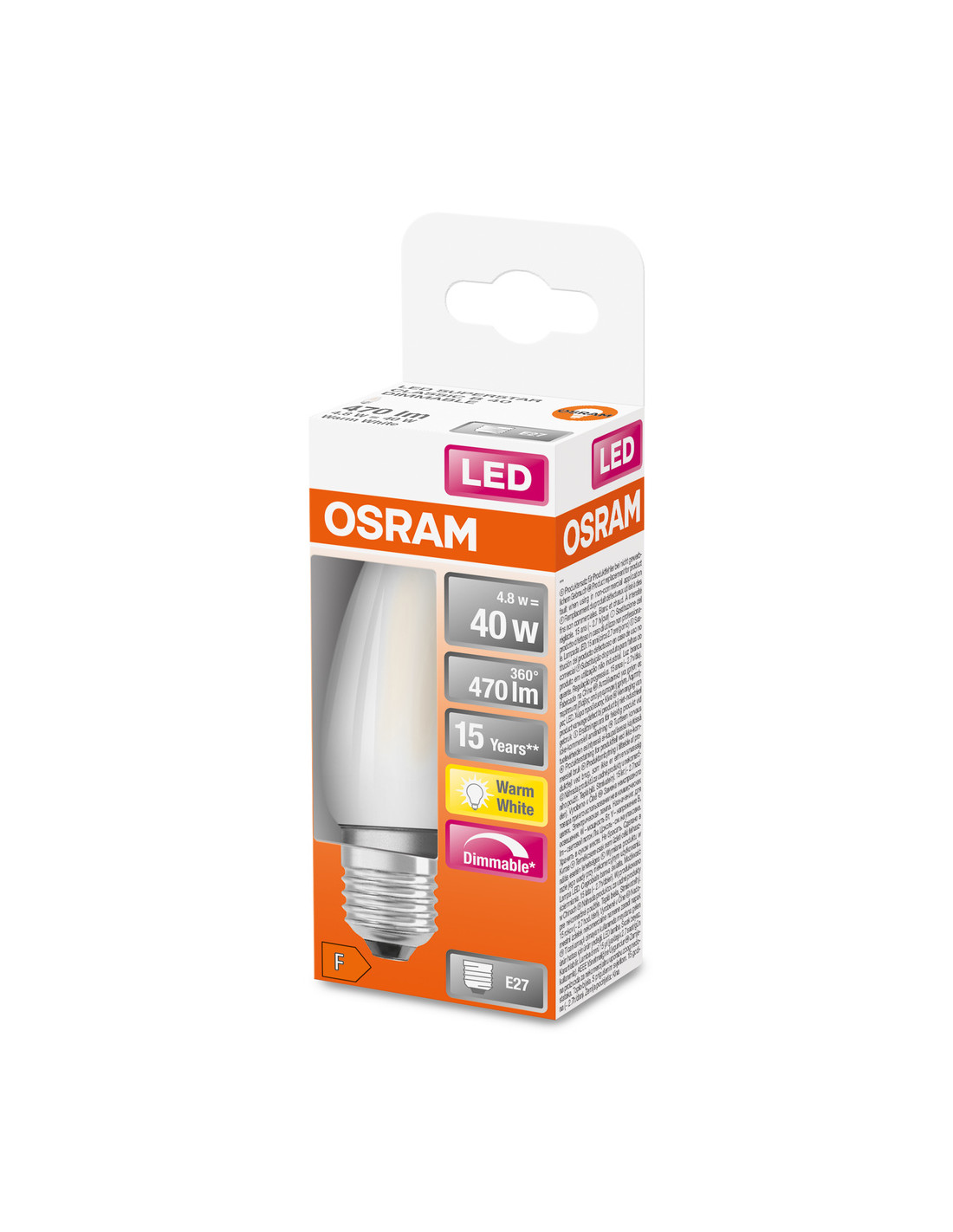 Cechy produktu: Lampy LED dla napięcia sieciowego. Ściemnialne (za pomocą licznych popularnych ściemniaczy, zobacz więcej www.ledvance.pl/dim). Kąt wiązki światła: do 300°. Trwałość do 15 000 h. Lampa wykonana ze szkła. Dobra jakość światła, wskaźnik oddawania barw Ra: 80; stała chromatyczność. Zalety produktu: Lampy wyposażone w innowacyjną technologię „włókien” LED. Niższe zużycie energii w porównaniu do lamp żarowych lub halogenowych. Natychmiast 100 % światła, bez czasu nagrzewania. Łatwy montaż zamiast zwykłych żarówek. Konstrukcja, wymiary i strumień świetlny porównywalne z tradycyjną żarówką. Obszary zastosowań: Doskonałe rozwiązanie do instalacji dekoracyjnych. Zastosowania dekoracyjne. Oświetlenie ogólne. Do użytku na zewnątrz tylko w odpowiednich oprawach zewnętrznych. Porady dotyczące bezpieczeństwa: Nie dotykaj lampy, jeśli jest stłuczona.. Nie wolno używać, jeśli zewnętrzne źródło światła jest uszkodzone..