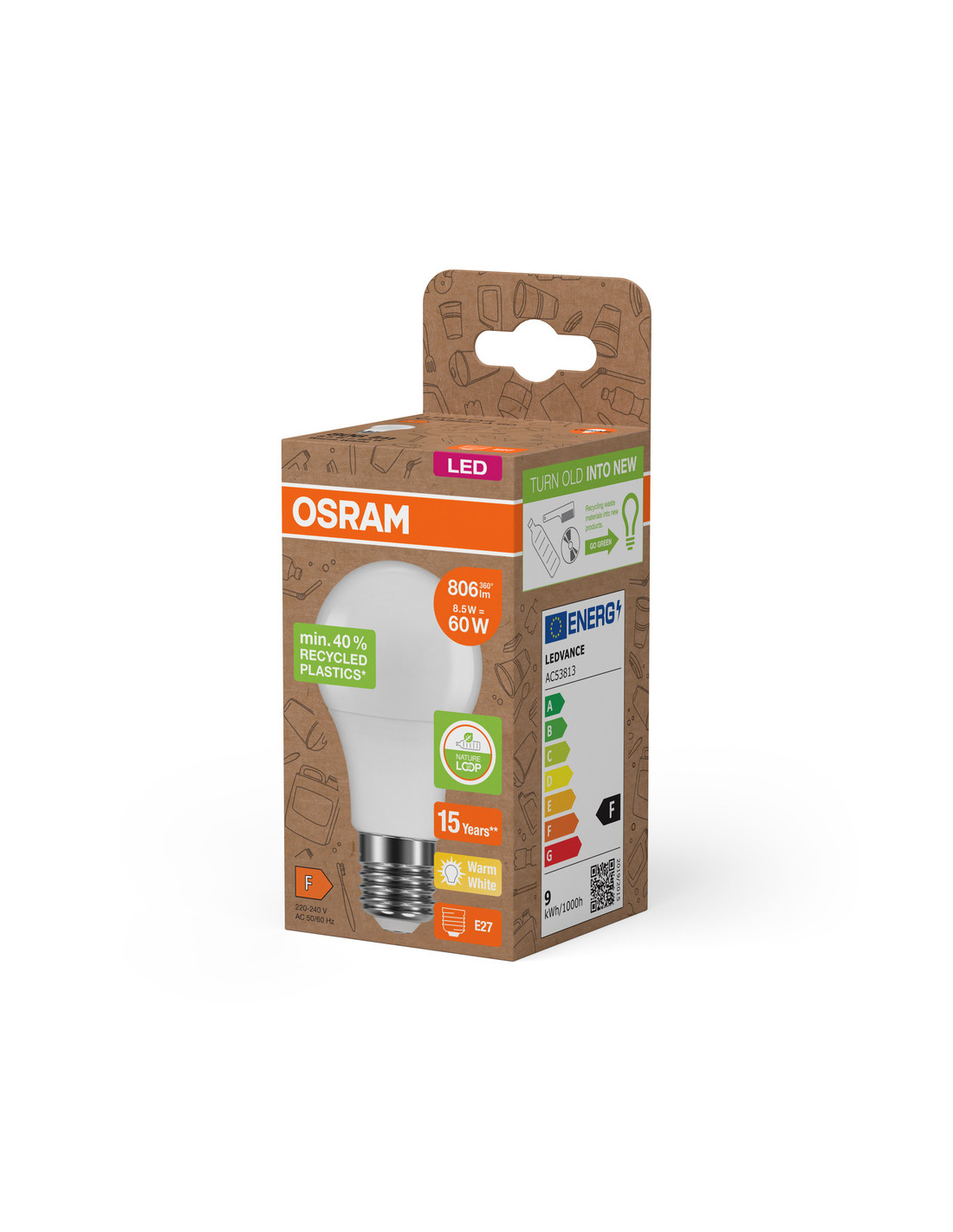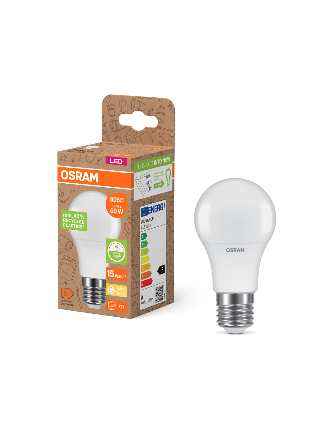 Cechy produktu: LED zamienniki tradycyjnych żarówek. Lampy niezawierające rtęci. Wykorzystano co najmniej 40% plastiku pochodzącego z recyklingu (w stosunku do całkowitej masy plastiku).. Zalety produktu: Niższe zużycie energii w porównaniu do lamp żarowych lub halogenowych. Prosty w użyciu zamiennik żarówek klasycznych dzięki kompaktowej konstrukcji. Natychmiast 100 % światła, bez czasu nagrzewania. Wykonana z tworzyw sztucznych pochodzących z recyklingu lampa przyczynia się do ograniczenia emisji CO2 i ilości odpadów składowanych na wysypiskach. Obszary zastosowań: Zastosowania domowe. Oświetlenie ogólne. Do użytku na zewnątrz tylko w odpowiednich oprawach zewnętrznych. Porady dotyczące bezpieczeństwa: Nie dotykaj lampy, jeśli jest stłuczona.. Nie wolno używać, jeśli zewnętrzne źródło światła jest uszkodzone..