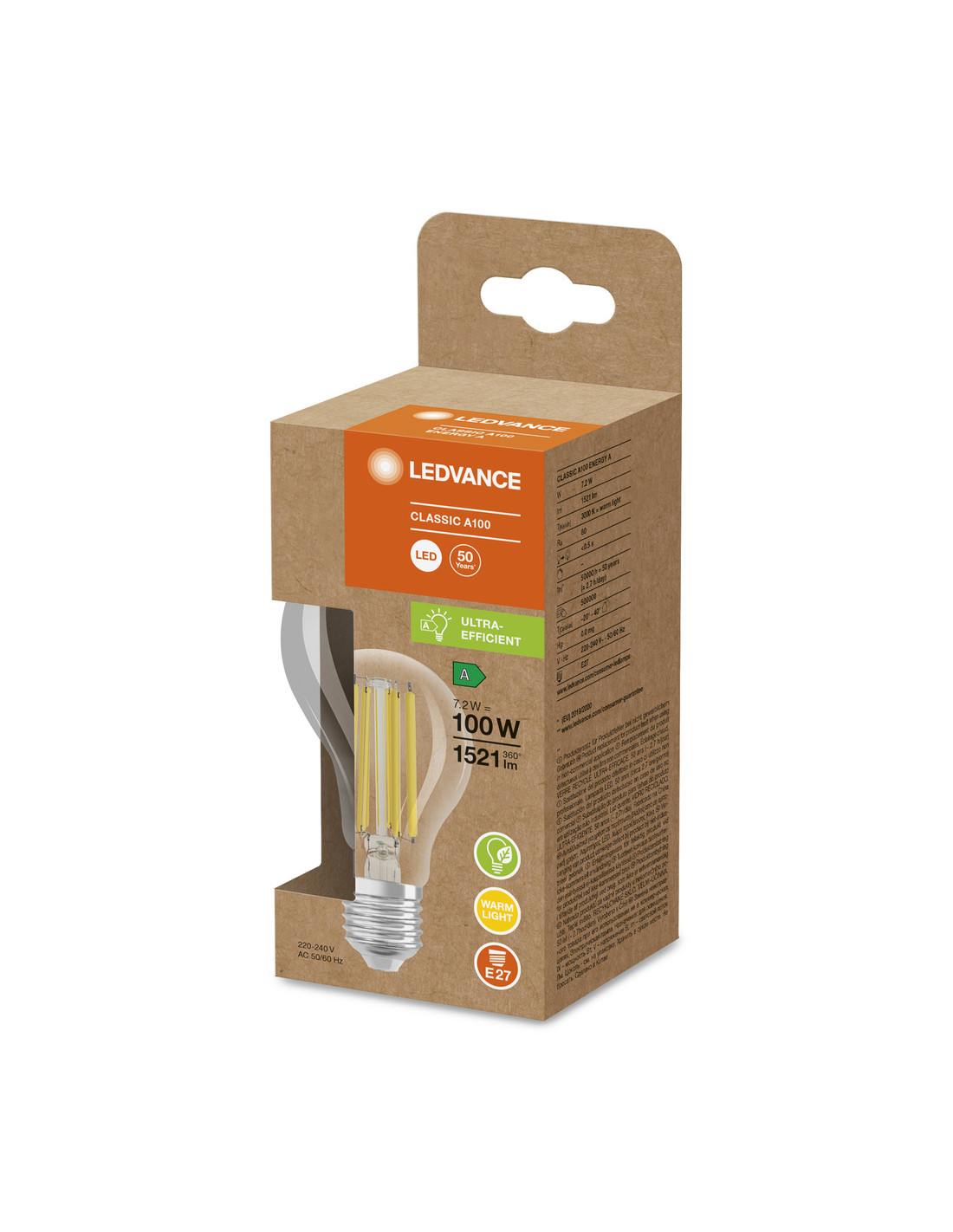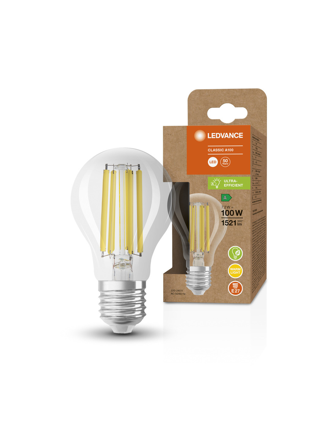 Cechy produktu: Lampy LED dla napięcia sieciowego. Skuteczność świetlna do 210 lm/W. Kąt wiązki światła: do 300°. Długa trwałość do 50 000 godzin. Bardzo duża liczba cykli przełączania 500 000. Zalety produktu: Lampy wyposażone w innowacyjną technologię „włókien” LED. Niskie zużycie energii. Wygląd, wymiary i strumień świetlny porównywalne z żarówkami halogenowymi. Natychmiast 100 % światła, bez czasu nagrzewania. Niskie tętnienie światła. Obszary zastosowań: Doskonałe rozwiązanie do instalacji dekoracyjnych. Zastosowania domowe. Oświetlenie ogólne. Do użytku na zewnątrz tylko w odpowiednich oprawach zewnętrznych. Porady dotyczące bezpieczeństwa: Nie dotykaj lampy, jeśli jest stłuczona.. Nie wolno używać, jeśli zewnętrzne źródło światła jest uszkodzone..
