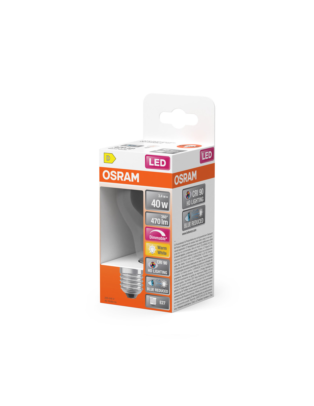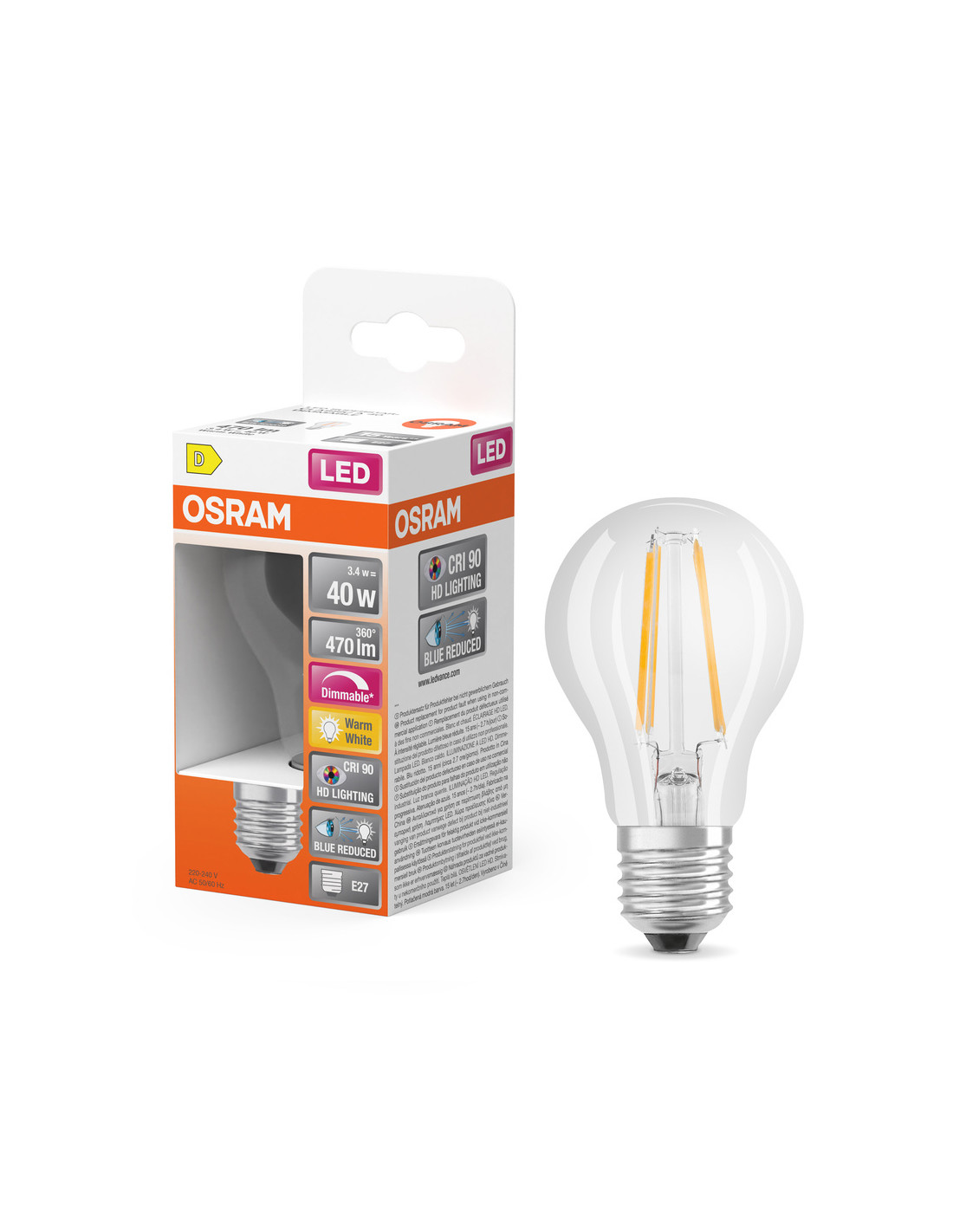 Cechy produktu: Lampy LED dla napięcia sieciowego. Kąt wiązki światła: do 300°. Ściemnialne. Wskaźnik oddawania barw Ra: 90. Zalety produktu: Lampy wyposażone w innowacyjną technologię „włókien” LED. Wygląd, wymiary i strumień świetlny porównywalne z żarówkami halogenowymi. Widmo światła naturalnego z doskonałym wskaźnikiem oddawania barw Ra > 90. Znacznie zmniejszony zakres niebieskiego światła. Poprawiony komfort widzenia i zmniejszone zmęczenie wzroku. Niższe zużycie energii w porównaniu do lamp żarowych lub halogenowych. Natychmiast 100 % światła, bez czasu nagrzewania. Niskie tętnienie światła. Obszary zastosowań: Doskonałe rozwiązanie do instalacji dekoracyjnych. Zastosowania domowe. Oświetlenie ogólne. Do użytku na zewnątrz tylko w odpowiednich oprawach zewnętrznych. Porady dotyczące bezpieczeństwa: Nie dotykaj lampy, jeśli jest stłuczona.. Nie wolno używać, jeśli zewnętrzne źródło światła jest uszkodzone..