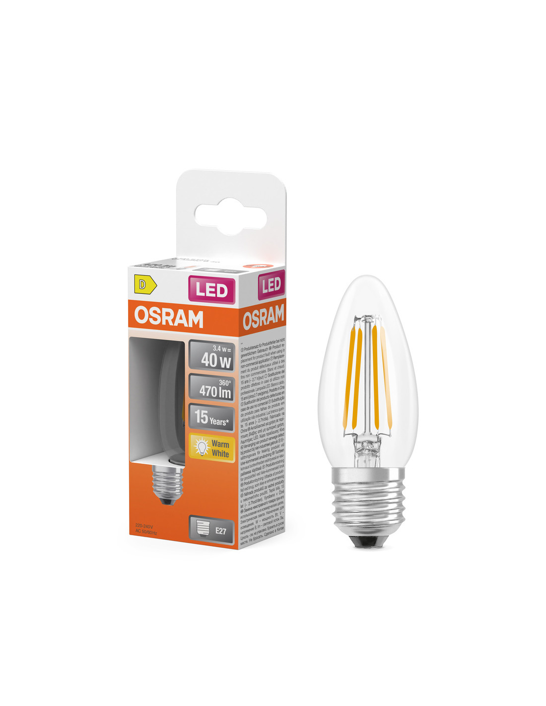 Cechy produktu: Profesjonalne lampy dla napięcia sieciowego. Brak możliwości regulacji strumienia świetlnego. Dobra jakość światła, wskaźnik oddawania barw Ra: 80; stała chromatyczność. Trwałość do 15 000 h. Lampa wykonana ze szkła. Zalety produktu: Lampy wyposażone w innowacyjną technologię „włókien” LED. Wygląd, wymiary i strumień świetlny porównywalne z tradycyjnymi żarówkami lub żarówkami halogenowymi. Brak promieniowania UV i podczerwonego w wiązce światła. Natychmiast 100 % światła, bez czasu nagrzewania. Niskie obciążenie cieplne (w porównaniu ze standardowym produktem referencyjnym). Łatwy montaż zamiast zwykłych żarówek. Niższe zużycie energii w porównaniu do lamp żarowych lub halogenowych. Obszary zastosowań: Doskonałe rozwiązanie do instalacji dekoracyjnych. Zastosowania domowe. Oświetlenie ogólne. Do użytku na zewnątrz tylko w odpowiednich oprawach zewnętrznych. Porady dotyczące bezpieczeństwa: Nie dotykaj lampy, jeśli jest stłuczona.. Nie wolno używać, jeśli zewnętrzne źródło światła jest uszkodzone..