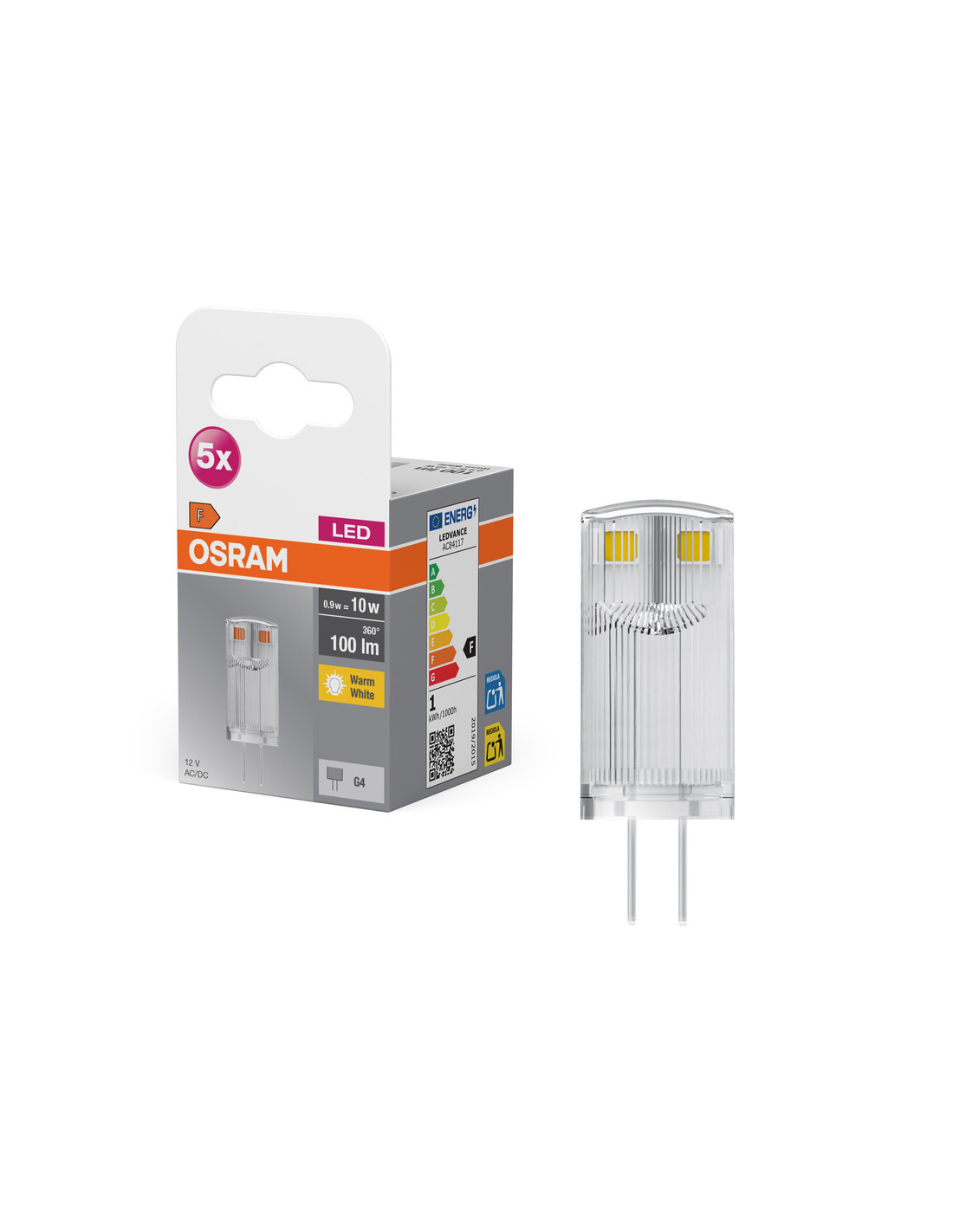 ŻARÓWKA 5-PAK LED PIN10 CL 0,9W 2700K ciepła biała 320° 100LM 12V G4