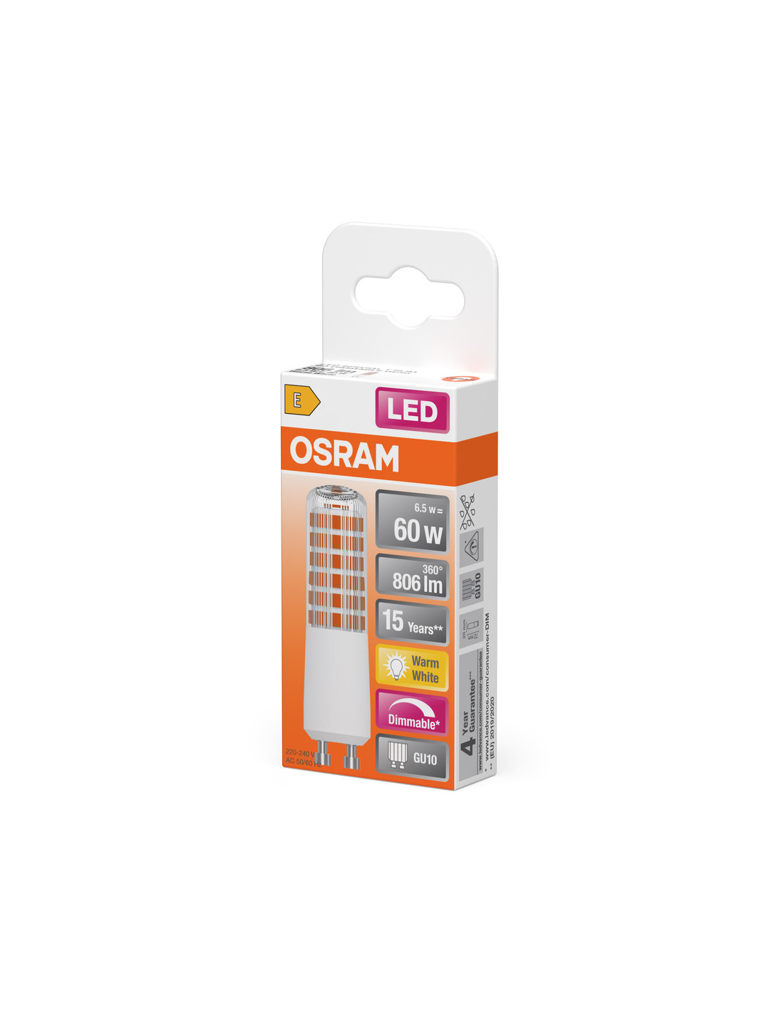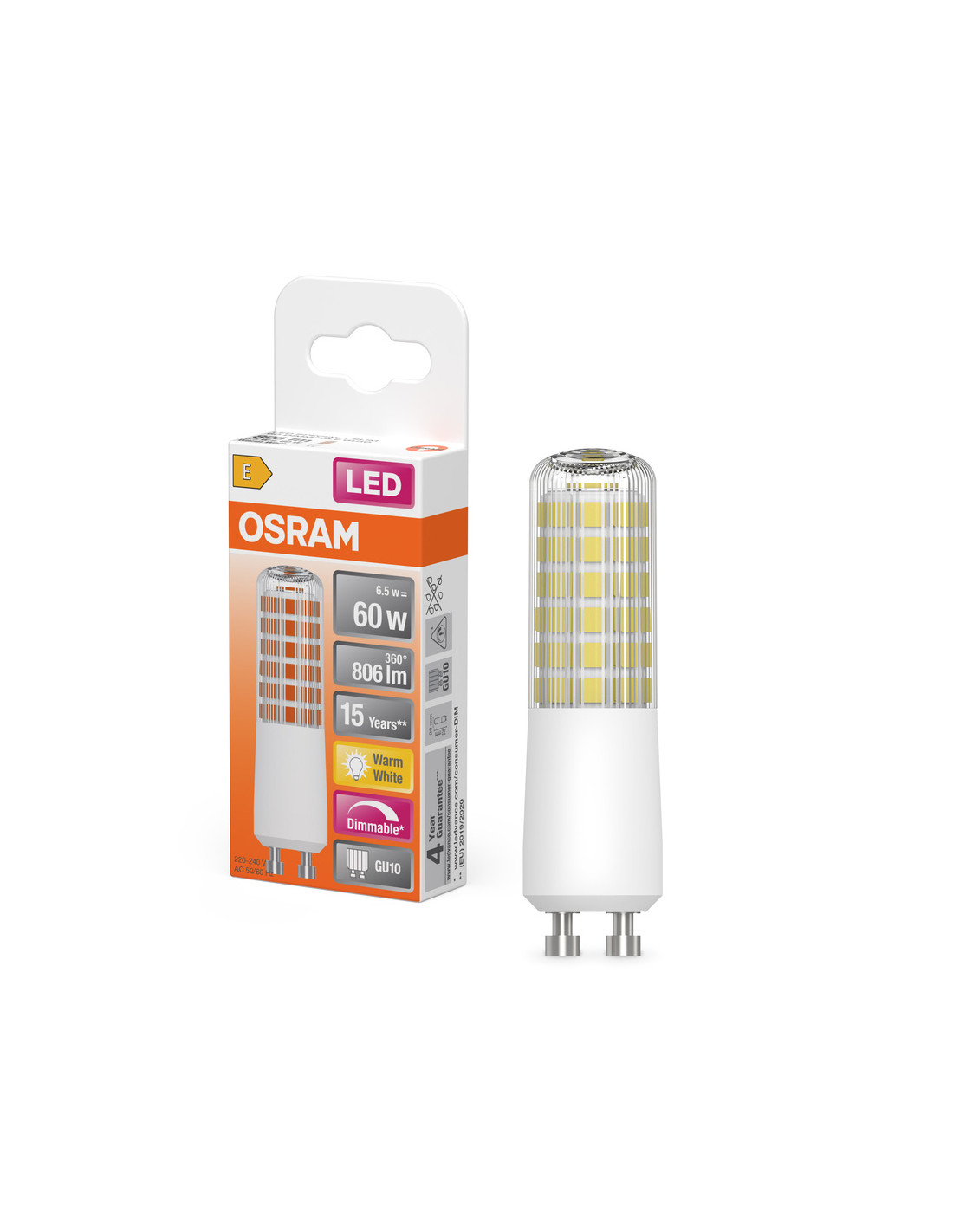 Cechy produktu: Ściemnialne (za pomocą licznych popularnych ściemniaczy, zobacz więcej www.ledvance.pl/dim). Zamienniki LED dla konwencjonalnych żarówek wysokonapięciowych. Dobra jakość światła, wskaźnik oddawania barw Ra: 80; stała chromatyczność. Zalety produktu: Prosty w użyciu zamiennik żarówek halogenowych dzięki kompaktowej konstrukcji. Idealne zwłaszcza do małych opraw designerskich. Niskie obciążenie cieplne (w porównaniu ze standardowym produktem referencyjnym). 3-letnia gwarancja. Niższe zużycie energii w porównaniu do lamp żarowych lub halogenowych. Obszary zastosowań: Małe oprawy designerskie. Tam, gdzie potrzebne są wydajne lampy kompaktowe. Do użytku na zewnątrz tylko w odpowiednich oprawach zewnętrznych. Porady dotyczące bezpieczeństwa: Nie dotykaj lampy, jeśli jest stłuczona.. Nie wolno używać, jeśli zewnętrzne źródło światła jest uszkodzone.. Aby zapewnić pełną wydajność oświetlenia i trwałość produktu, zalecane jest demontaż szyby lub osłony oprawy oświetleniowej..