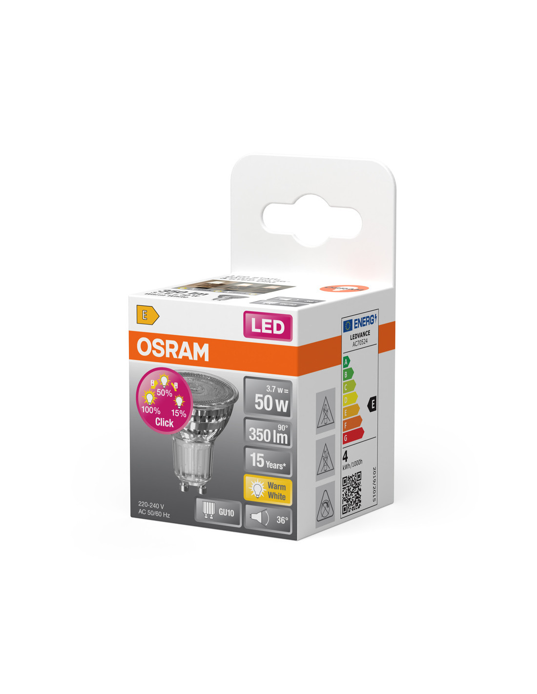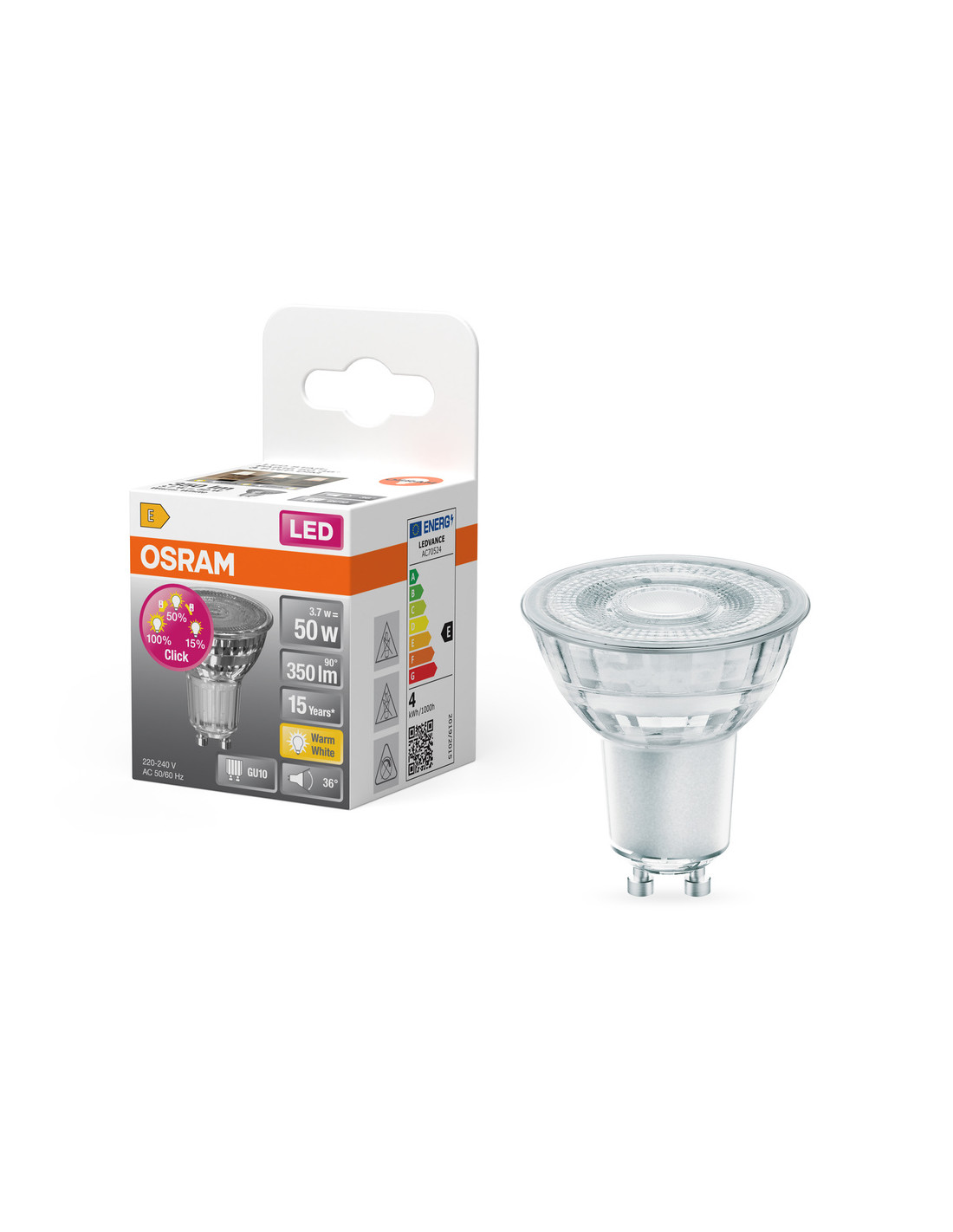 Cechy produktu: Zamiennik LED dla wysokonapięciowych żarówek halogenowych. Trzonek: GU10. Lampa wykonana ze szkła. Dobra jakość światła, wskaźnik oddawania barw Ra: 80. Trwałość do 15 000 h. Zalety produktu: Łatwe, trzystopniowe przyciemnianie poprzez wielokrotne naciskanie przełącznika ściennego. Szybka, prosta i bezpieczna wymiana bez zmiany okablowania. Wygląd, wymiary i strumień świetlny porównywalne z tradycyjnymi żarówkami lub żarówkami halogenowymi. Niski koszt konserwacji dzięki długiej trwałości. Brak promieniowania UV i podczerwonego w wiązce światła. Bardzo wysoka kompatybilność ze ściemniaczem, patrz również www.ledvance.com/dim. Natychmiast 100 % światła, bez czasu nagrzewania. Niższe zużycie energii w porównaniu do lamp żarowych lub halogenowych. Obszary zastosowań: Sklepy i pomieszczenia wystawowe. Zastosowania domowe. Zastosowania komercyjne. Oświetlenie akcentujące. Do użytku na zewnątrz tylko w odpowiednich oprawach zewnętrznych. Porady dotyczące bezpieczeństwa: Nie dotykaj lampy, jeśli jest stłuczona.. Nie wolno używać, jeśli zewnętrzne źródło światła jest uszkodzone..