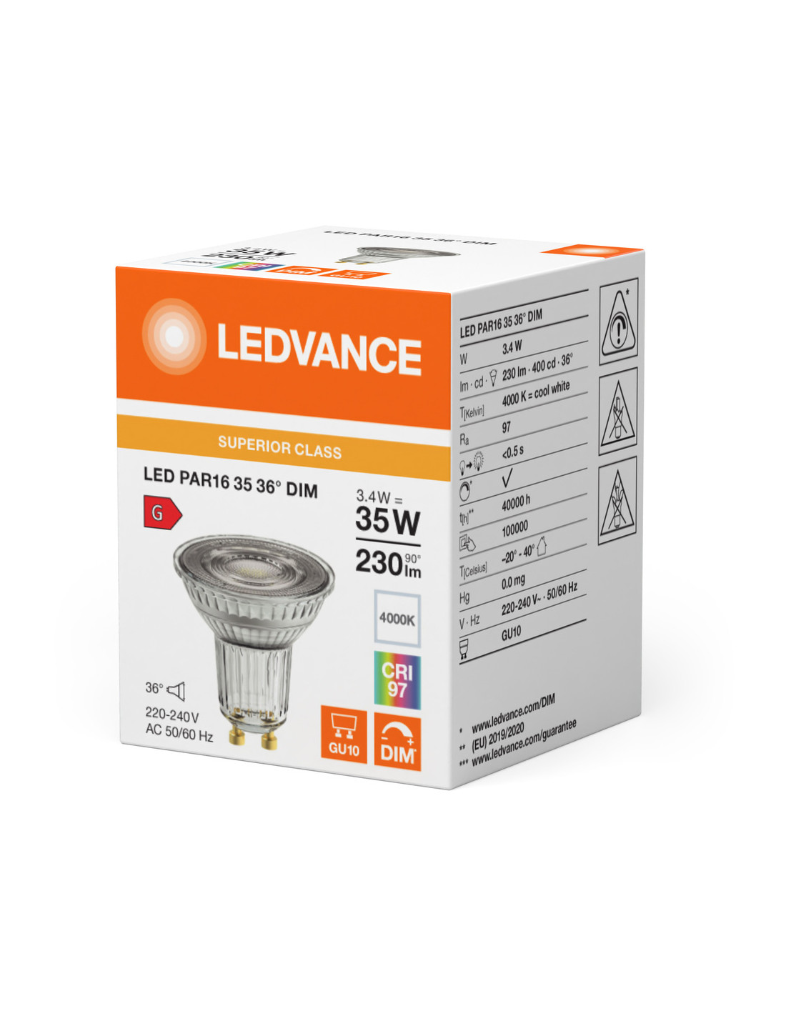 Cechy produktu: Zamiennik LED dla wysokonapięciowych żarówek halogenowych. Wysoka jednolitość barwy : 3 SDCM. Ściemnialne. Trzonek: GU10. Lampa wykonana ze szkła. Wysoki wskaźnik oddawania barw (Ra: 97). Trwałość: do 40 000 h. Zalety produktu: Szybka, prosta i bezpieczna wymiana bez zmiany okablowania. Wygląd, wymiary i strumień świetlny porównywalne z tradycyjnymi żarówkami lub żarówkami halogenowymi. Niski koszt konserwacji dzięki długiej trwałości. Brak promieniowania UV i podczerwonego w wiązce światła. Bezstopniowe ściemnianie. Bardzo wysoka kompatybilność ze ściemniaczem, patrz również www.ledvance.com/dim. Natychmiast 100 % światła, bez czasu nagrzewania. Niższe zużycie energii w porównaniu do lamp żarowych lub halogenowych. Obszary zastosowań: Sklepy i pomieszczenia wystawowe. Zastosowania domowe. Zastosowania komercyjne. Oświetlenie akcentujące. Do użytku na zewnątrz tylko w odpowiednich oprawach zewnętrznych. Porady dotyczące bezpieczeństwa: Nie dotykaj lampy, jeśli jest stłuczona.. Nie wolno używać, jeśli zewnętrzne źródło światła jest uszkodzone..