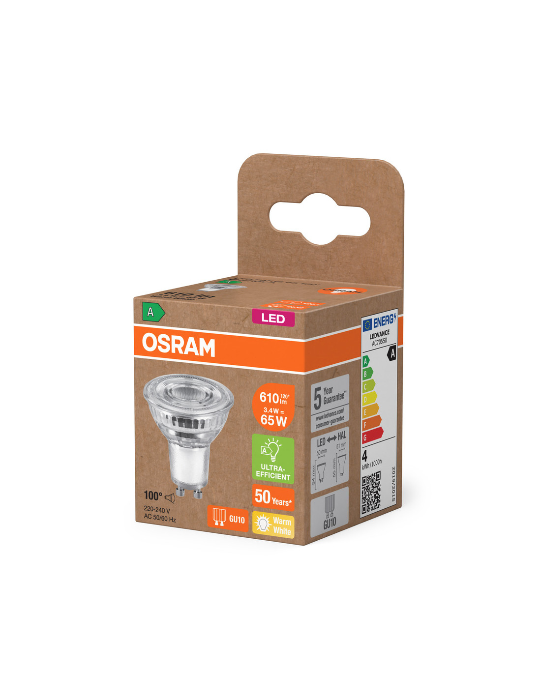 Cechy produktu: Zamiennik LED dla wysokonapięciowych żarówek halogenowych. Długa trwałość do 50 000 godzin. Skuteczność świetlna: do 180 lm/W. Bardzo duża liczba cykli łączeniowych do 100 000. Zalety produktu: Wygląd, wymiary i strumień świetlny porównywalne z żarówkami halogenowymi. Niskie zużycie energii. Natychmiast 100 % światła, bez czasu nagrzewania. Niskie tętnienie światła. Obszary zastosowań: Zastosowania domowe. Oświetlenie ogólne. Do użytku na zewnątrz tylko w odpowiednich oprawach zewnętrznych. Porady dotyczące bezpieczeństwa: Nie dotykaj lampy, jeśli jest stłuczona.. Nie wolno używać, jeśli zewnętrzne źródło światła jest uszkodzone..