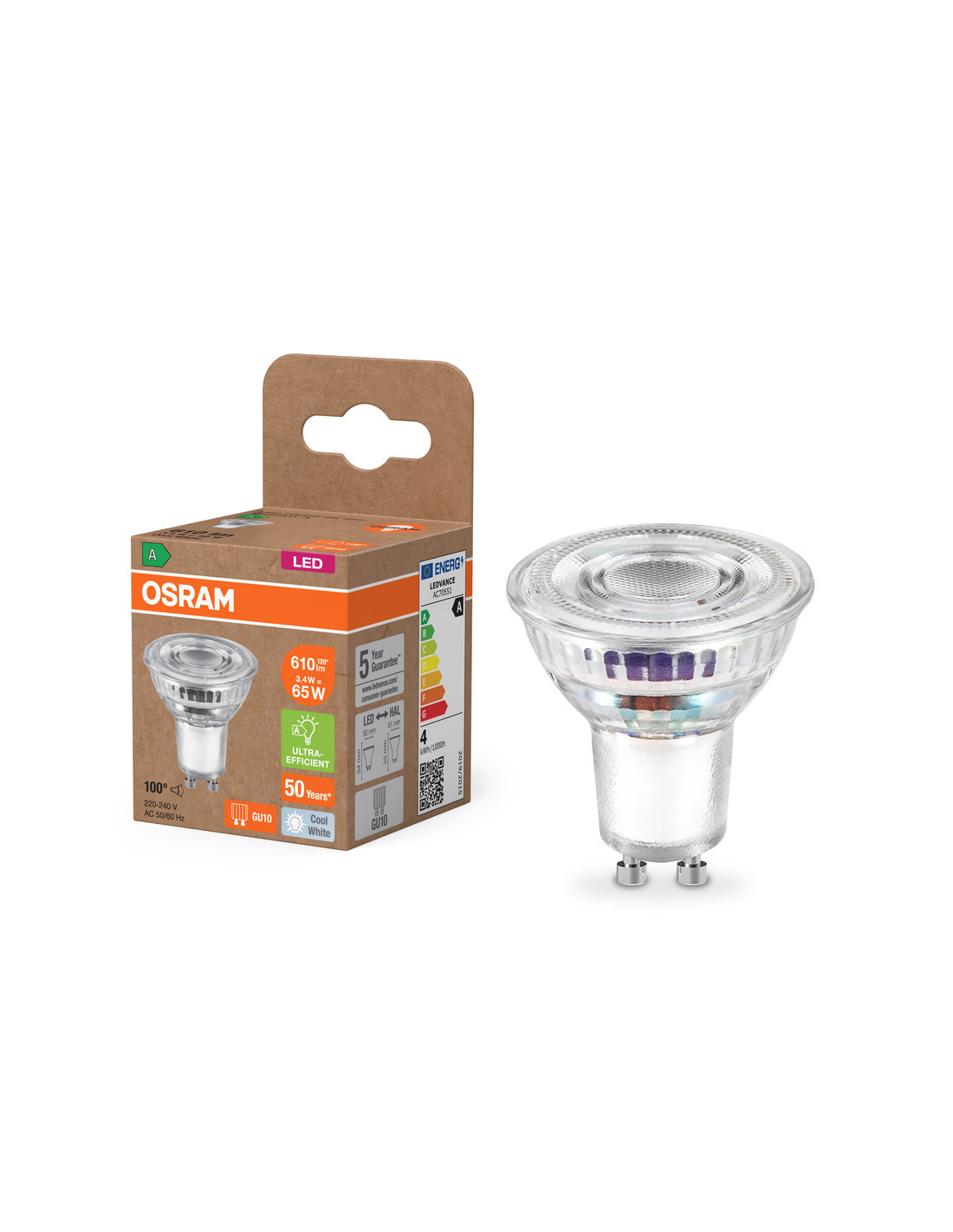 Cechy produktu: Zamiennik LED dla wysokonapięciowych żarówek halogenowych. Długa trwałość do 50 000 godzin. Skuteczność świetlna: do 180 lm/W. Bardzo duża liczba cykli łączeniowych do 100 000. Zalety produktu: Wygląd, wymiary i strumień świetlny porównywalne z żarówkami halogenowymi. Niskie zużycie energii. Natychmiast 100 % światła, bez czasu nagrzewania. Niskie tętnienie światła. Obszary zastosowań: Zastosowania domowe. Oświetlenie ogólne. Do użytku na zewnątrz tylko w odpowiednich oprawach zewnętrznych. Porady dotyczące bezpieczeństwa: Nie dotykaj lampy, jeśli jest stłuczona.. Nie wolno używać, jeśli zewnętrzne źródło światła jest uszkodzone..