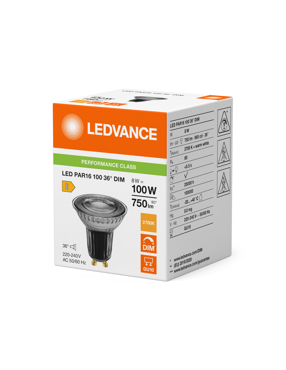 Cechy produktu: Zamiennik LED dla wysokonapięciowych żarówek halogenowych. Wysoka jedorodność barw: 5 sdcm. Ściemnialne. Lampa wykonana ze szkła. Zalety produktu: Szybka, prosta i bezpieczna wymiana bez zmiany okablowania. Wygląd, wymiary i strumień świetlny porównywalne z tradycyjnymi żarówkami lub żarówkami halogenowymi. Niski koszt konserwacji dzięki długiej trwałości. Brak promieniowania UV i podczerwonego w wiązce światła. Bezstopniowe ściemnianie. Bardzo wysoka kompatybilność ze ściemniaczem, patrz również www.ledvance.com/dim. Natychmiast 100 % światła, bez czasu nagrzewania. Niższe zużycie energii w porównaniu do lamp żarowych lub halogenowych. Obszary zastosowań: Sklepy i pomieszczenia wystawowe. Zastosowania domowe. Zastosowania komercyjne. Oświetlenie akcentujące. Do użytku na zewnątrz tylko w odpowiednich oprawach zewnętrznych. Porady dotyczące bezpieczeństwa: Nie dotykaj lampy, jeśli jest stłuczona.. Nie wolno używać, jeśli zewnętrzne źródło światła jest uszkodzone..