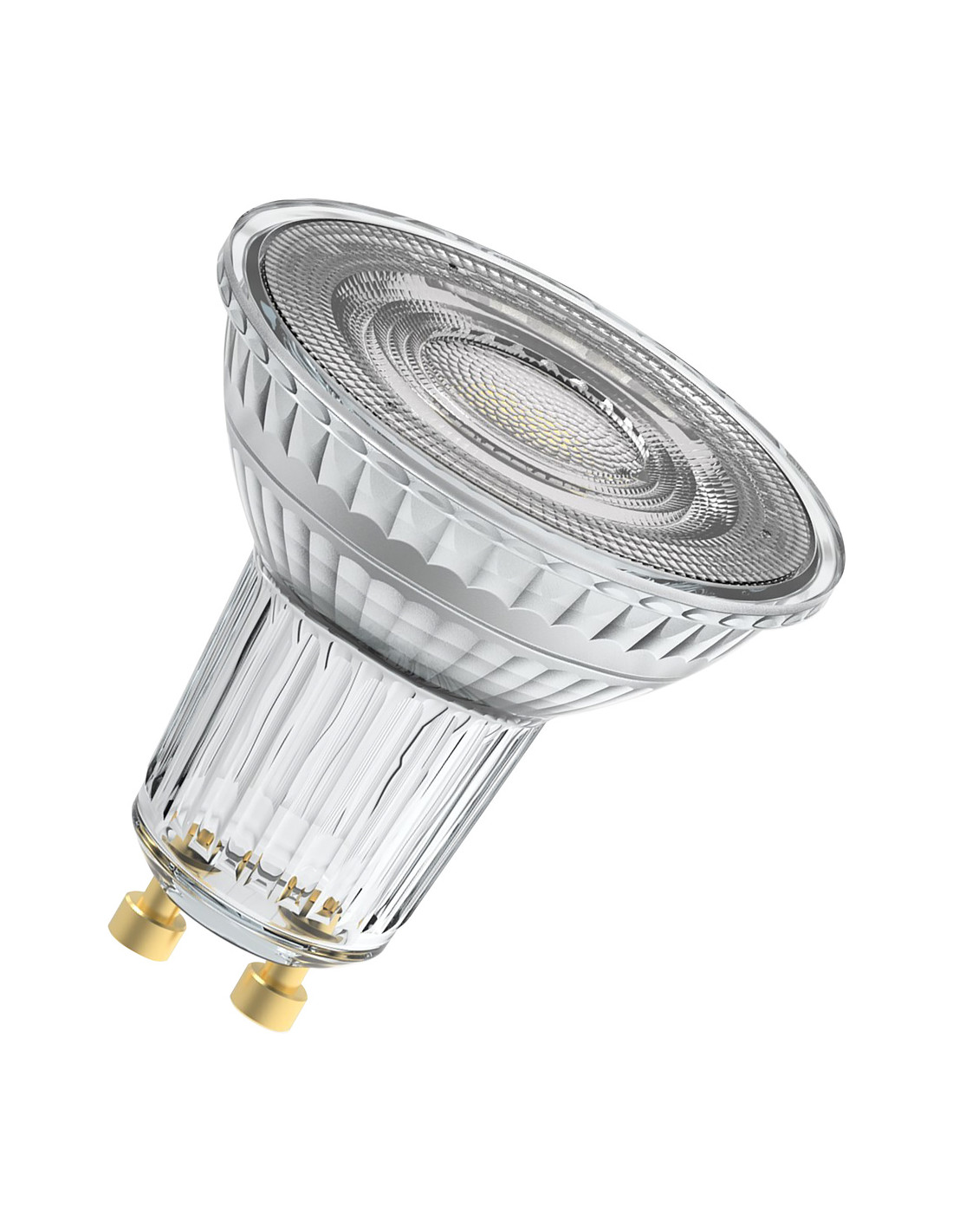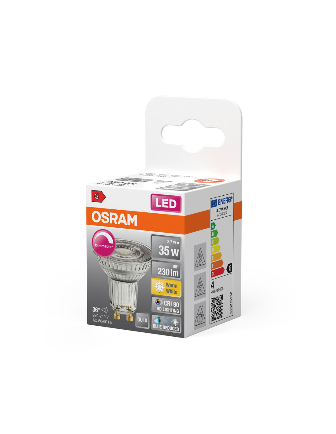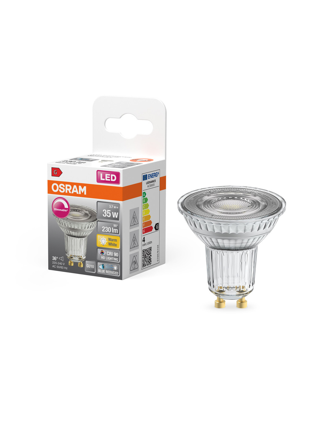 Cechy produktu: Zamienniki LED dla konwencjonalnych żarówek niskonapięciowych. Ściemnialne. Trzonek: GU10. Wskaźnik oddawania barw Ra: 90. Lampa wykonana ze szkła. Zalety produktu: Szybka, prosta i bezpieczna wymiana bez zmiany okablowania. Wygląd, wymiary i strumień świetlny porównywalne z żarówkami halogenowymi. Widmo światła naturalnego z doskonałym wskaźnikiem oddawania barw Ra > 90. Znacznie zmniejszony zakres niebieskiego światła. Poprawiony komfort widzenia i zmniejszone zmęczenie wzroku. Niskie koszty eksploatacji dzięki długiej trwałości. Niskie tętnienie światła. Niższe zużycie energii w porównaniu do lamp żarowych lub halogenowych. Obszary zastosowań: Sklepy i pomieszczenia wystawowe. Zastosowania domowe. Zastosowania komercyjne. Oświetlenie akcentujące. Do użytku na zewnątrz tylko w odpowiednich oprawach zewnętrznych. Porady dotyczące bezpieczeństwa: Nie dotykaj lampy, jeśli jest stłuczona.. Nie wolno używać, jeśli zewnętrzne źródło światła jest uszkodzone..