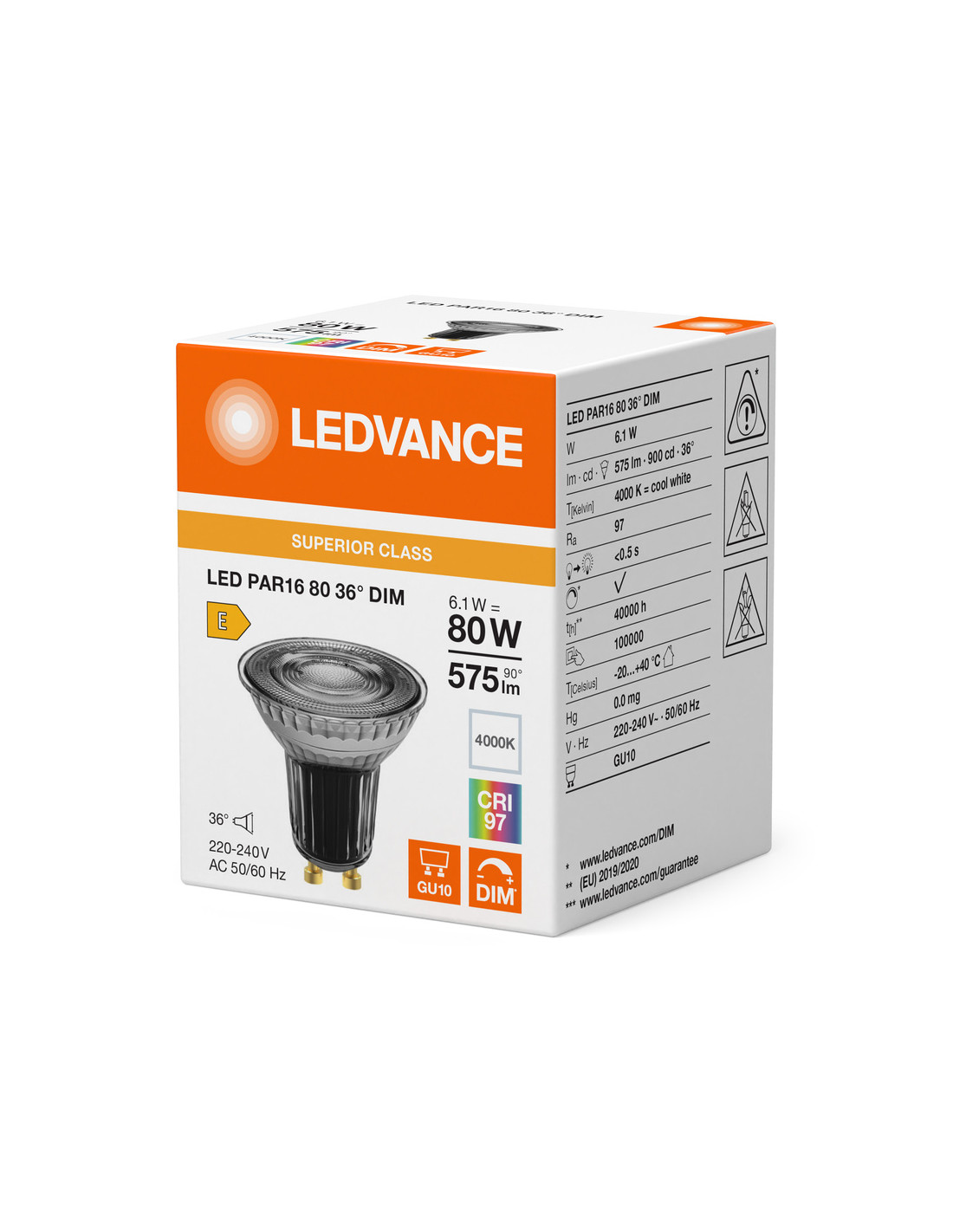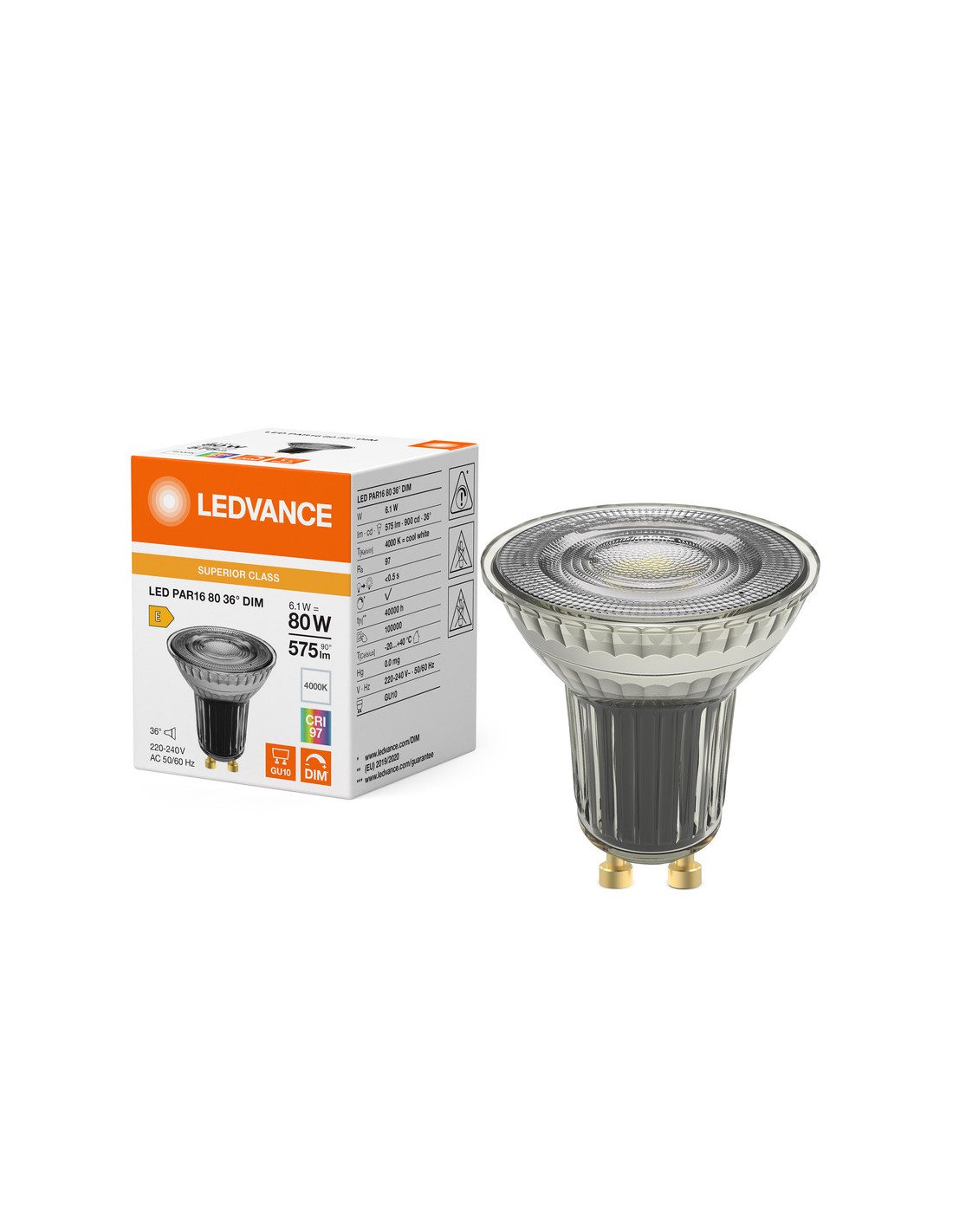 Cechy produktu: Zamiennik LED dla wysokonapięciowych żarówek halogenowych. Wysoka jednolitość barwy : 3 SDCM. Ściemnialne. Trzonek: GU10. Lampa wykonana ze szkła. Wysoki wskaźnik oddawania barw (Ra: 97). Trwałość: do 40 000 h. Zalety produktu: Szybka, prosta i bezpieczna wymiana bez zmiany okablowania. Wygląd, wymiary i strumień świetlny porównywalne z tradycyjnymi żarówkami lub żarówkami halogenowymi. Niski koszt konserwacji dzięki długiej trwałości. Brak promieniowania UV i podczerwonego w wiązce światła. Bezstopniowe ściemnianie. Bardzo wysoka kompatybilność ze ściemniaczem, patrz również www.ledvance.com/dim. Natychmiast 100 % światła, bez czasu nagrzewania. Niższe zużycie energii w porównaniu do lamp żarowych lub halogenowych. Obszary zastosowań: Sklepy i pomieszczenia wystawowe. Zastosowania domowe. Zastosowania komercyjne. Oświetlenie akcentujące. Do użytku na zewnątrz tylko w odpowiednich oprawach zewnętrznych. Porady dotyczące bezpieczeństwa: Nie dotykaj lampy, jeśli jest stłuczona.. Nie wolno używać, jeśli zewnętrzne źródło światła jest uszkodzone..