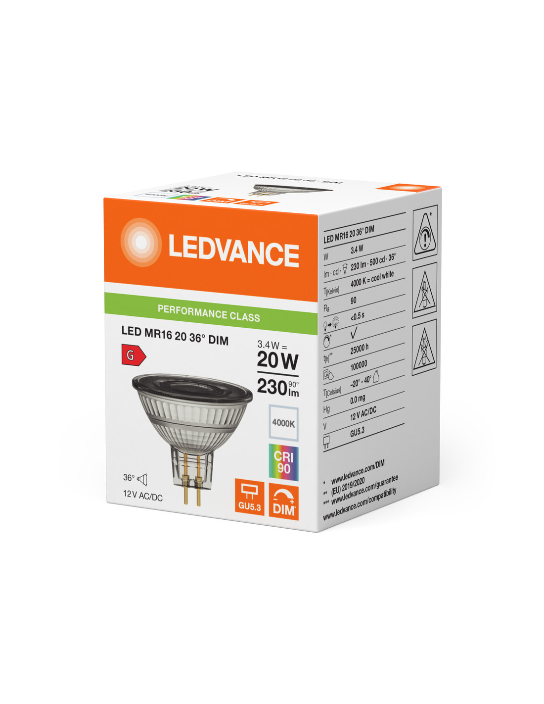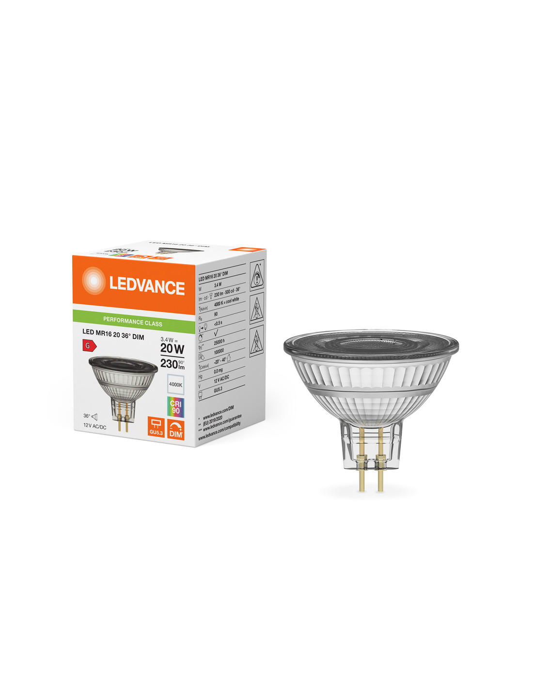 Cechy produktu: Zamiennik LED dla niskonapięciowych żarówek halogenowych. Wysoka jedorodność barw: 5 SDCM. Ściemnialne. Trzonek: GU5.3. Lampa wykonana ze szkła. Bardzo dobre oddawanie barw (Ra: 90). Trwałość: do 25 000 h. Zalety produktu: Szybka, prosta i bezpieczna wymiana bez zmiany okablowania. Wygląd, wymiary i strumień świetlny porównywalne z tradycyjnymi żarówkami lub żarówkami halogenowymi. Niski koszt konserwacji dzięki długiej trwałości. Brak promieniowania UV i podczerwonego w wiązce światła. Bezstopniowe ściemnianie. Bardzo wysoka kompatybilność ze ściemniaczem, patrz również www.ledvance.com/dim. Kompatybilny z wieloma popularnymi statecznikami konwencjonalnymi i elektronicznymi (patrz także a href ="https://www.ledvance.com/low-voltage-ledlamps"lista kompatybilności/a). Natychmiast 100 % światła, bez czasu nagrzewania. Niższe zużycie energii w porównaniu do lamp żarowych lub halogenowych. Obszary zastosowań: Sklepy i pomieszczenia wystawowe. Zastosowania domowe. Zastosowania komercyjne. Oświetlenie akcentujące. Do użytku na zewnątrz tylko w odpowiednich oprawach zewnętrznych. Porady dotyczące bezpieczeństwa: Nie dotykaj lampy, jeśli jest stłuczona.. Nie wolno używać, jeśli zewnętrzne źródło światła jest uszkodzone..