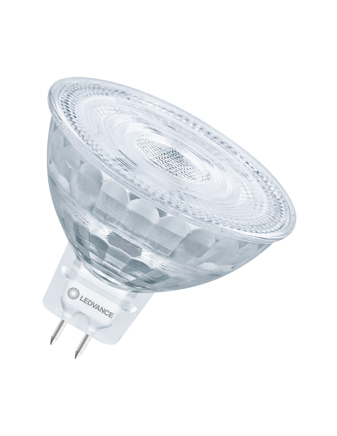 Cechy produktu: Zamiennik LED dla niskonapięciowych żarówek halogenowych. Wysoka jednolitość barwy : 3 SDCM. Ściemnialne. Trzonek: GU5.3. Lampa wykonana ze szkła. Wysoki wskaźnik oddawania barw (Ra: 97). Trwałość: do 40 000 h. Zalety produktu: Szybka, prosta i bezpieczna wymiana bez zmiany okablowania. Wygląd, wymiary i strumień świetlny porównywalne z tradycyjnymi żarówkami lub żarówkami halogenowymi. Niskie koszty eksploatacji dzięki długiej trwałości. Brak promieniowania UV i podczerwonego w wiązce światła. Bezstopniowe ściemnianie. Bardzo wysoka kompatybilność ze ściemniaczem, patrz również www.ledvance.com/dim. Kompatybilny z wieloma popularnymi statecznikami konwencjonalnymi i elektronicznymi (patrz także a href ="https://www.ledvance.com/low-voltage-ledlamps"lista kompatybilności/a). Natychmiast 100 % światła, bez czasu nagrzewania. Niższe zużycie energii w porównaniu do lamp żarowych lub halogenowych. Obszary zastosowań: Sklepy i pomieszczenia wystawowe. Zastosowania domowe. Zastosowania komercyjne. Oświetlenie akcentujące. Do użytku na zewnątrz tylko w odpowiednich oprawach zewnętrznych. Porady dotyczące bezpieczeństwa: Nie dotykaj lampy, jeśli jest stłuczona.. Nie wolno używać, jeśli zewnętrzne źródło światła jest uszkodzone..