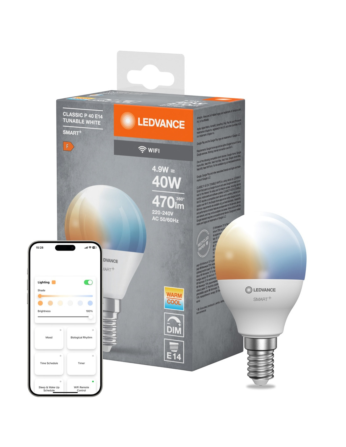 Cechy produktu: Możliwość sterowania za pomocą aplikacji LEDVANCE SMART+ (z systemem Android co najmniej 8.0 lub iOS 14.0). Możliwość sterowania przez Asystenta Google i Amazon Alexa. Protokół sieciowy: WiFi. Regulacja temperatury barwowej światła: 2700…6500 K. Ściemnialne. Trwałość: do 20 000 h. Zalety produktu: Sterowanie bezprzewodowe za pomocą aplikacji. Łatwy montaż i użycie. Nie zawiera rtęci. Niższe zużycie energii w porównaniu do lamp żarowych lub halogenowych. Obszary zastosowań: Oświetlenie ogólne. Pomieszczenia mieszkalne. Zastosowania profesjonalne (hotele, bary, butiki itp.). Do użytku na zewnątrz tylko w odpowiednich oprawach zewnętrznych. Wyposażenie / Akcesoria: Do sterowania za pomocą aplikacji LEDVANCE SMART+ wymagany jest smartfon lub tablet (z systemem Android co najmniej 8.0 lub iOS 14.0). Porady dotyczące bezpieczeństwa: Nie dotykaj lampy, jeśli jest stłuczona.. Nie wolno używać, jeśli zewnętrzne źródło światła jest uszkodzone..